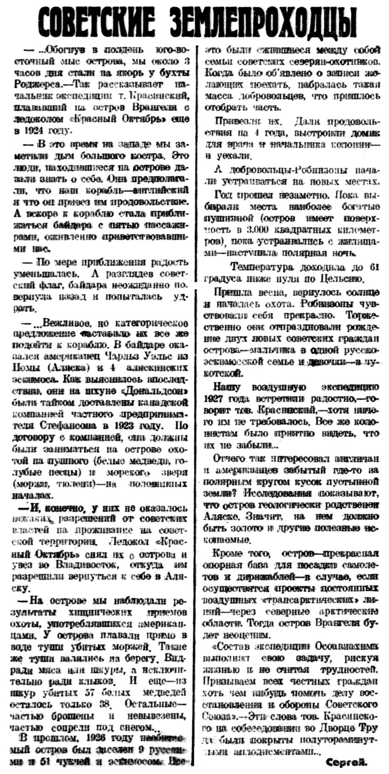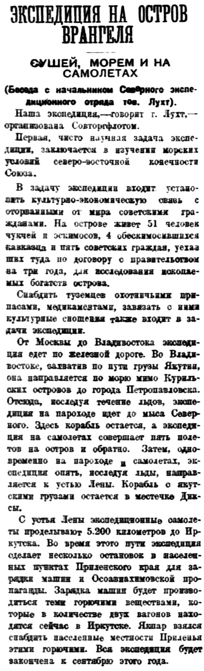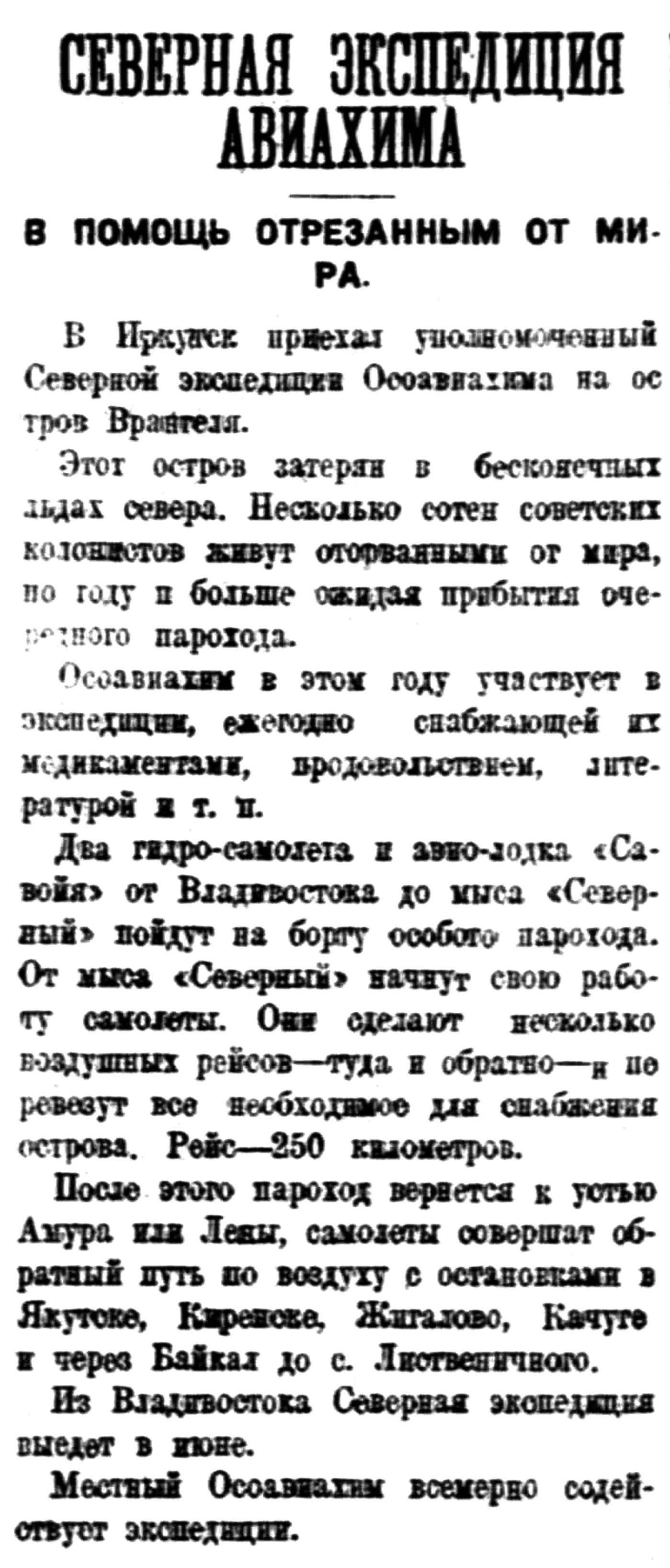 ОСО Авиахим предполагает организовать летом текущего года воздушную экспедицию на остров Врангеля. Экспедиция будет организована с целью обслуживания Советской колонии на острове Врангеля, основанной в 1926-м году и для исследования прилегающих к острову советских районов Северного Ледовитого Океана на пути кораблей к устью рек Колымы и Лены.