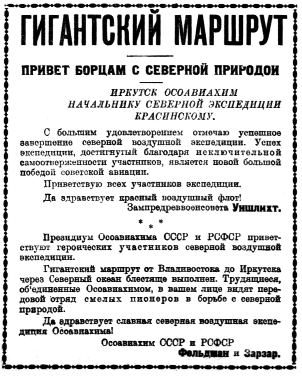Гигантский маршрут от Владивостока до Иркутска через Северный океан блестяще выполнен. Трудящиеся, объединенные Осоавиахимом, в вашем лице видят передовой отряд смелых пионеров в борьбе с северной природой.