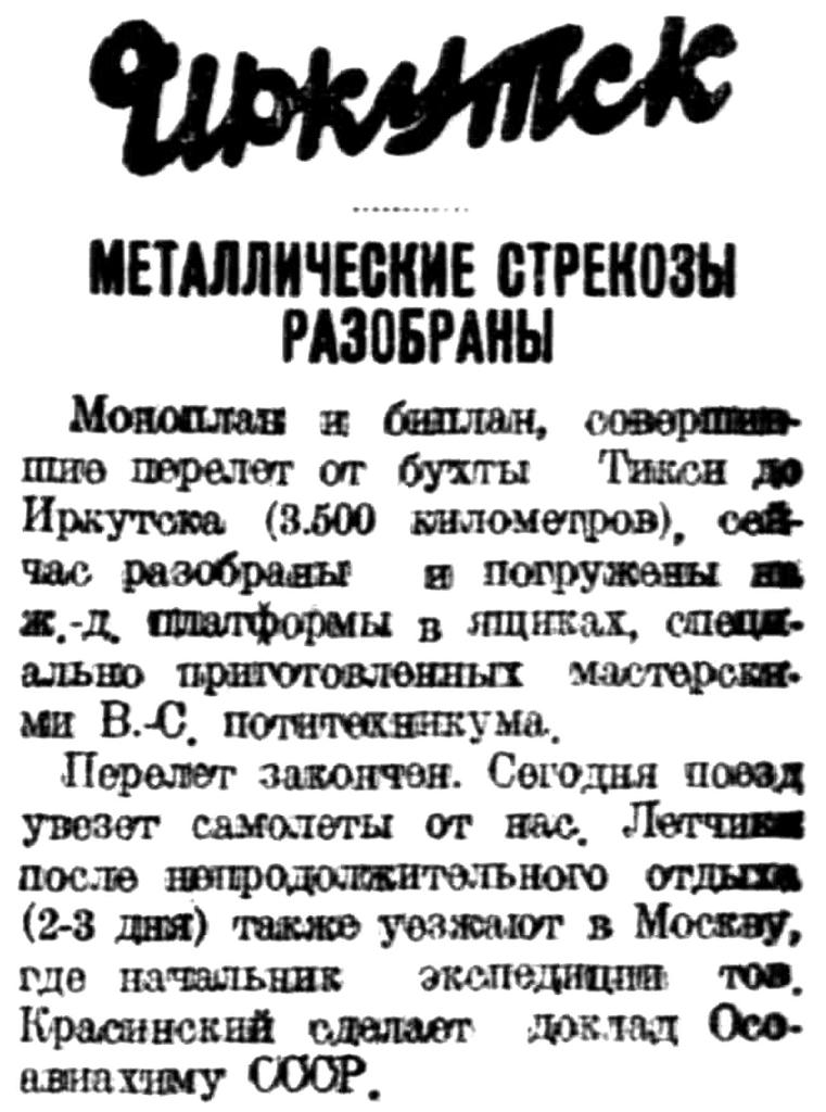 Моноплан и биплан, совершившие перелет от бухты Тикси до Иркутска (3.500 километров), сейчас разобраны и погружены на ж.-д. платформы в ящиках, специально приготовленных мастерскими В.-С. политехникума.