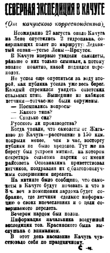 Неожиданно 27 августа около Качуга на Лене спустились 2 гидроплана, совершающих полет по маршруту: Ледовитый океан — устье Лены — Иркутск.