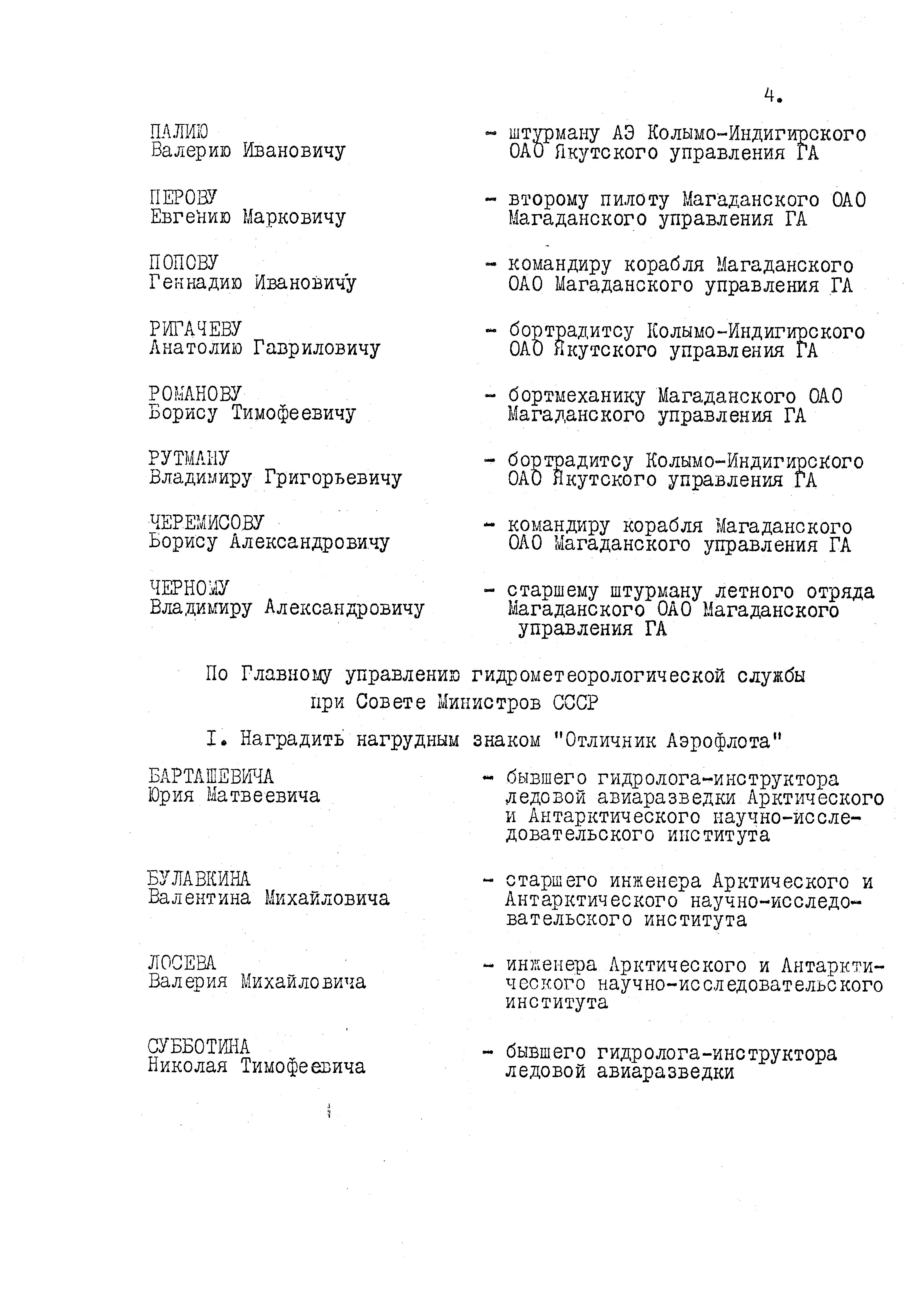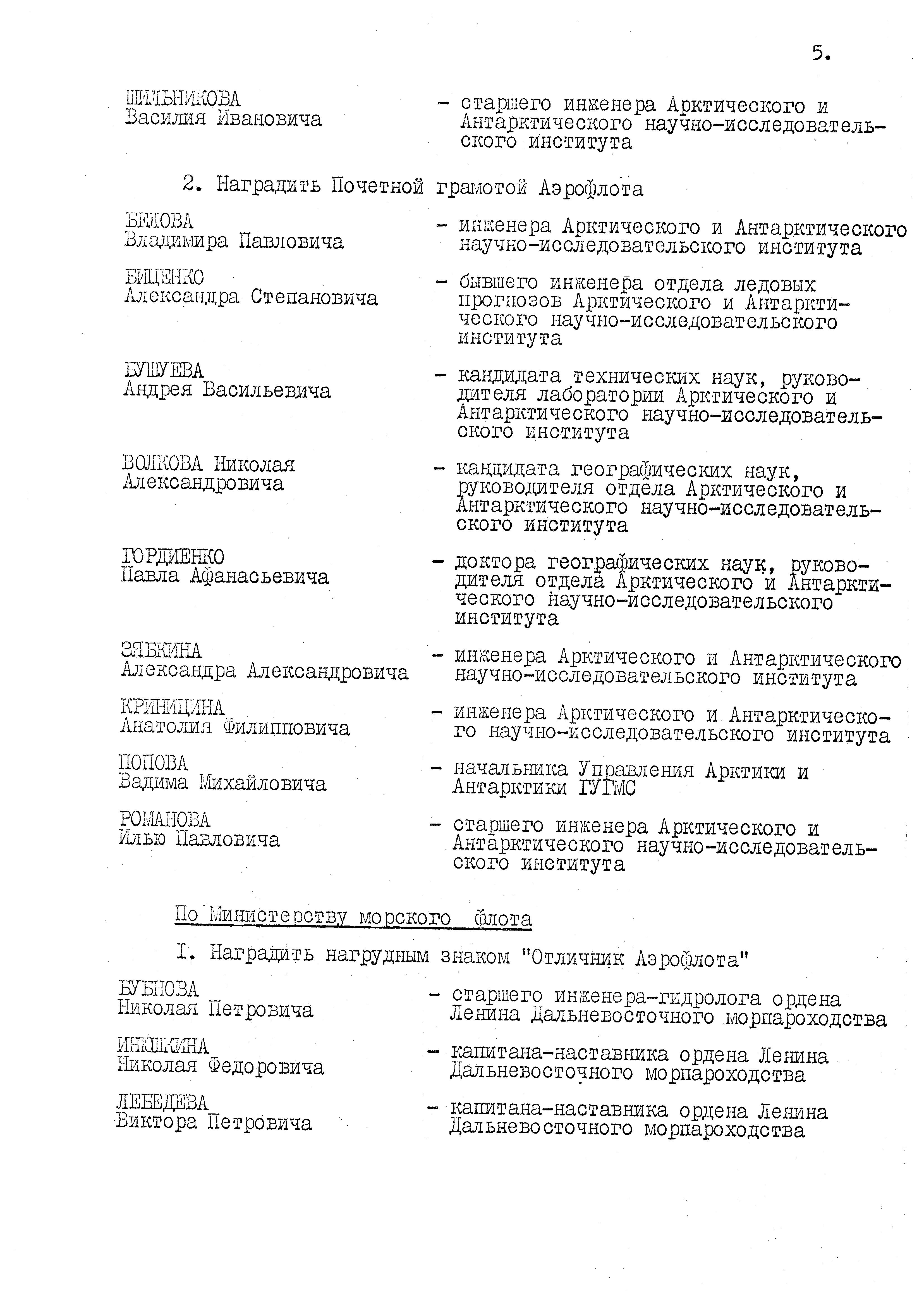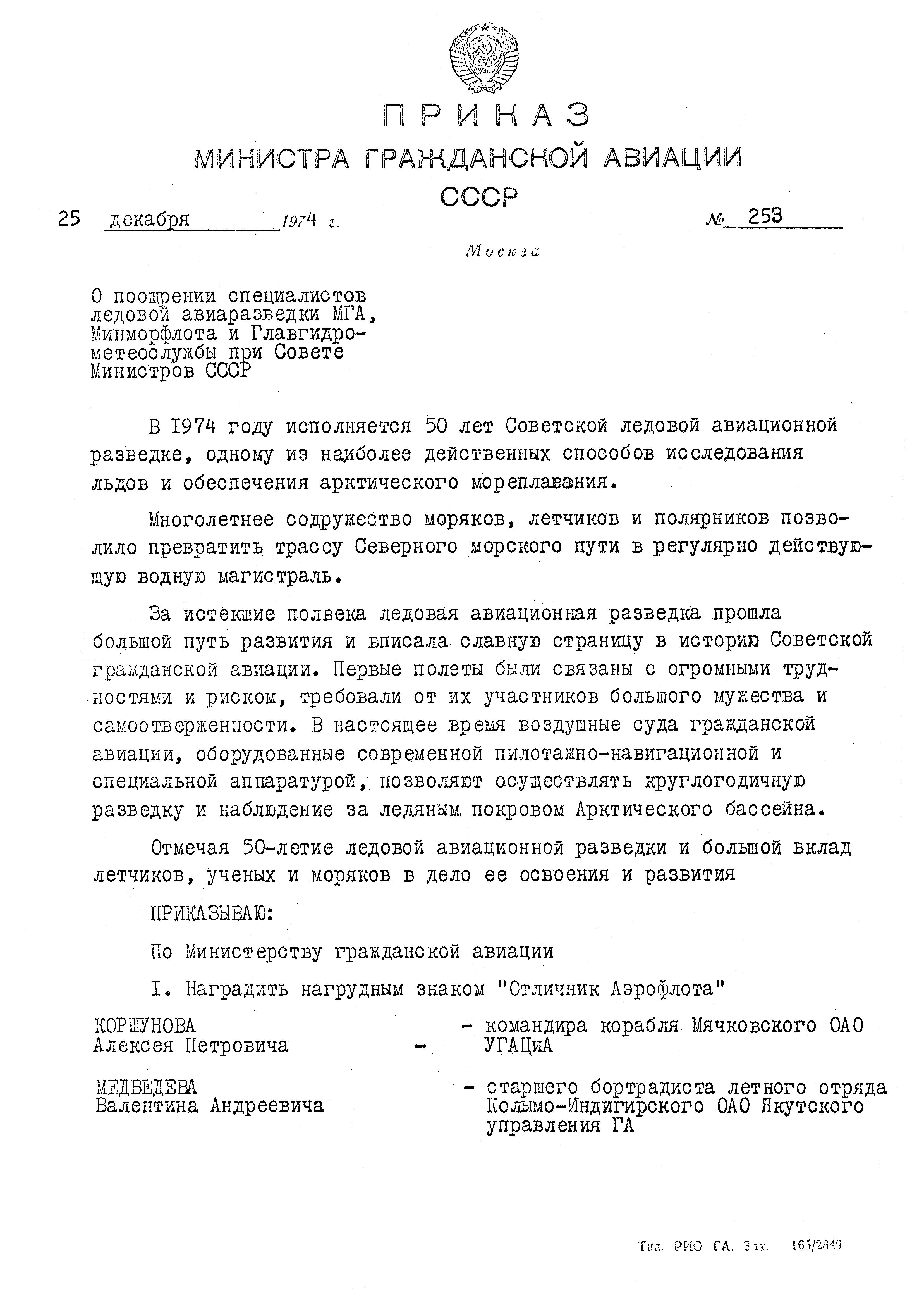 Декабрь 1974 года. Знаменательная юбилейная дата - 50 лет советской ледовой разведки. Приказ Министра Гражданской авиации СССР от 25 декабря 1974 г. № 258 "О поощрении специалистов ледовой разведки МГА, Минморфлота и Главгидрометеослужбы при Совете Министров СССР".