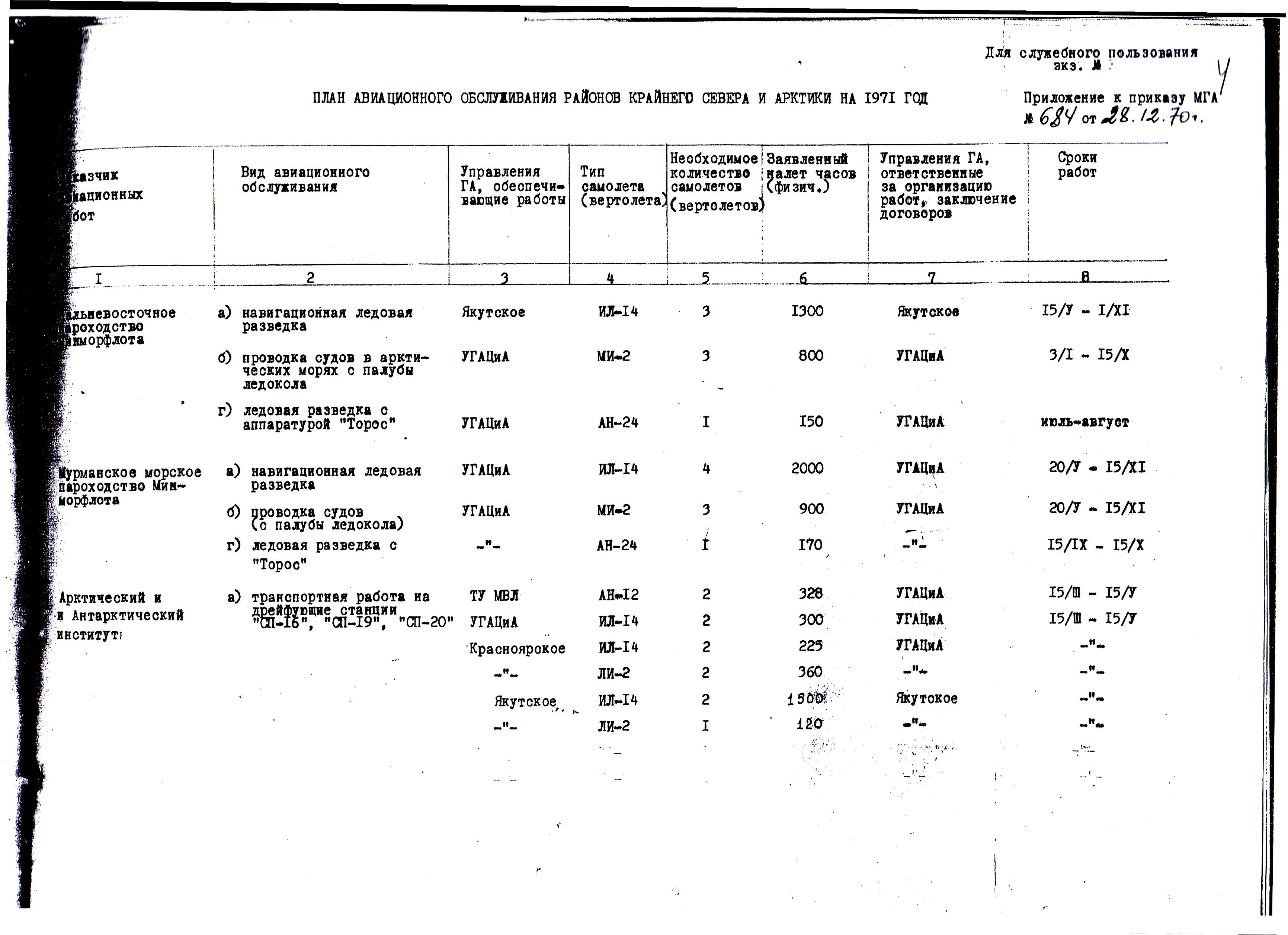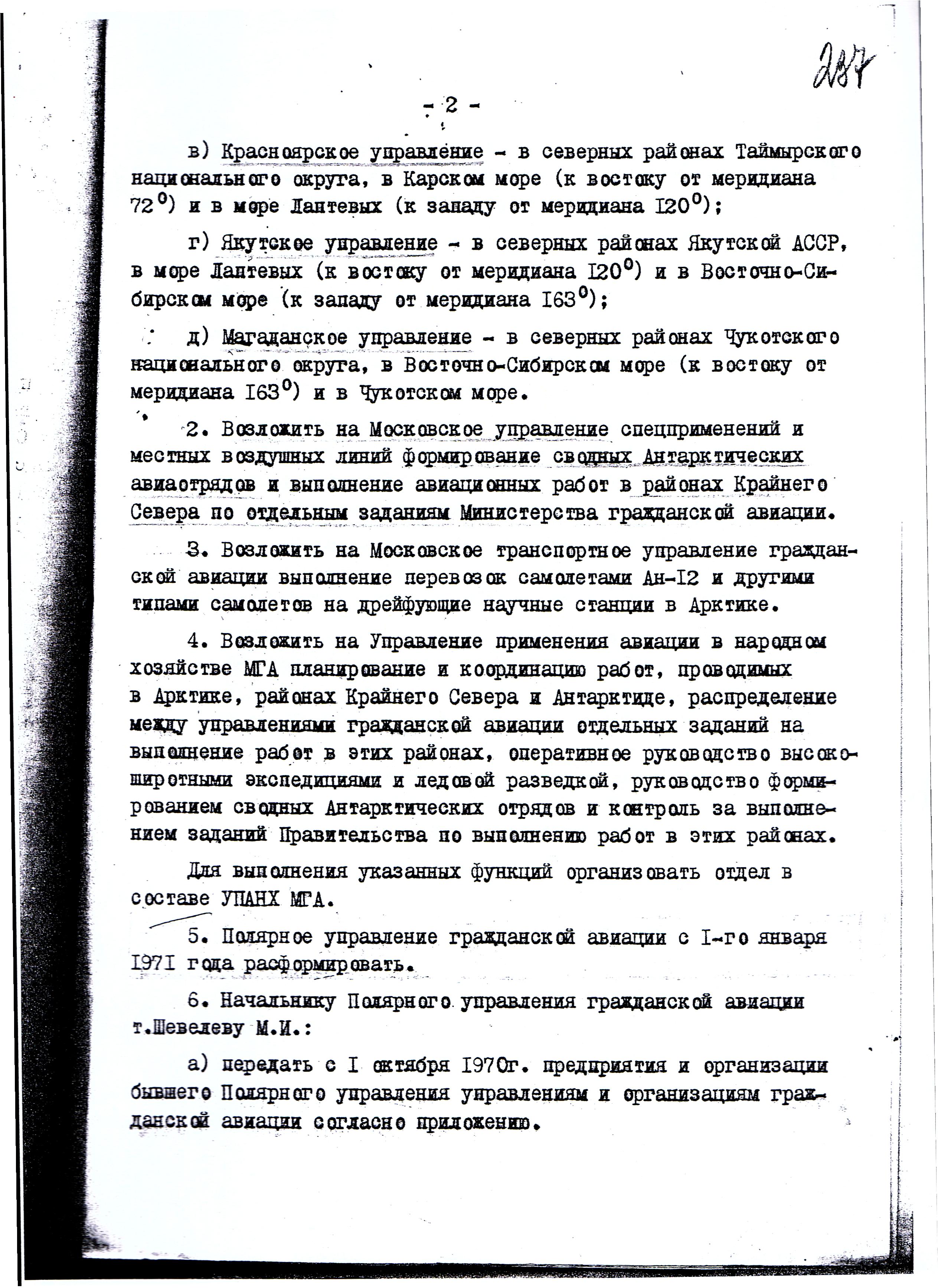 24 сентября 1970 г. был подписан исторический приказ министра Гражданской авиации СССР Б.П. Бугаева №541 "Об улучшении руководства авиационным обслуживанием районов Крайнего Севера, Арктики и Антарктиды", согласно которому Полярное управление Гражданской авиации с 1 января 1971 г. расформировывалось, а задачи по "выполнению работ по авиационному обслуживанию народного хозяйства и населения районов Крайнего Севера, а также работ по проведению ледовой разведки и обеспечению высокоширотных экспедиций в морях Северной Арктики", "формирование сводных Антарктических авиаотрядов..." возлагались на шесть территориальных управлений ГА.