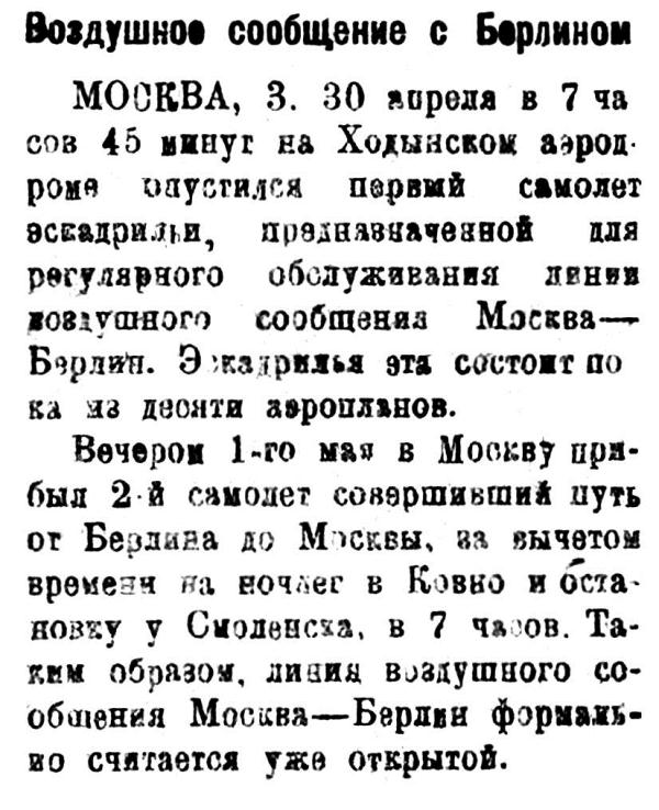 Германский летчик Штолльброк установил новый рекорд совершив без остановочный перелет из Москвы в Берлин в течение 15 часов. Со Штолльброком перелетели российский представитель в Германии Крестинский и сопровождавшие его лица.