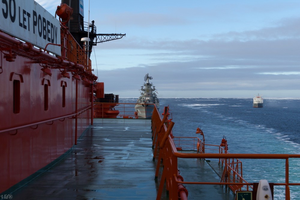 В этом походе участвует целая эскадра кораблей во главе с тяжелым атомным ракетным крейсером «Петр Великий». Проводку военных кораблей через Северный Ледовитый океан осуществляли атомные ледоколы. Отряд кораблей Северного флота сейчас находится в районе архипелага Новосибирских островов в Северном Ледовитом океане. Там же были проведены учения с высадкой морского десанта с борта больших десантных кораблей на необорудованное побережье. Также отработан захват плацдарма условного противника. С помощью авиации военные моряки разбили палаточный лагерь на острове Котельный. И уже приступили к работам по возведению военного аэродрома и авиационной комендатуры.