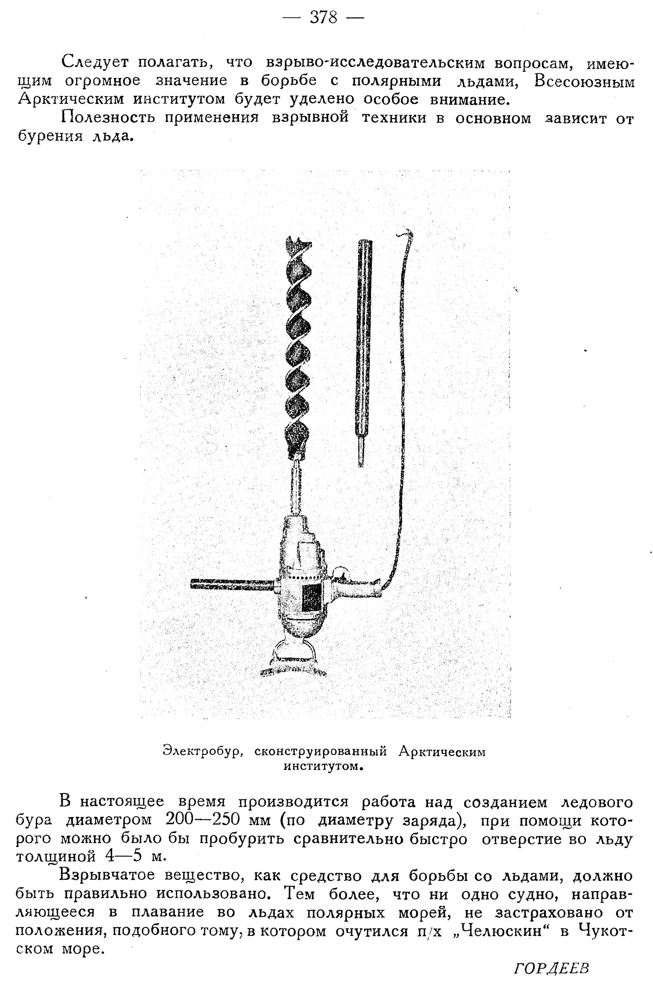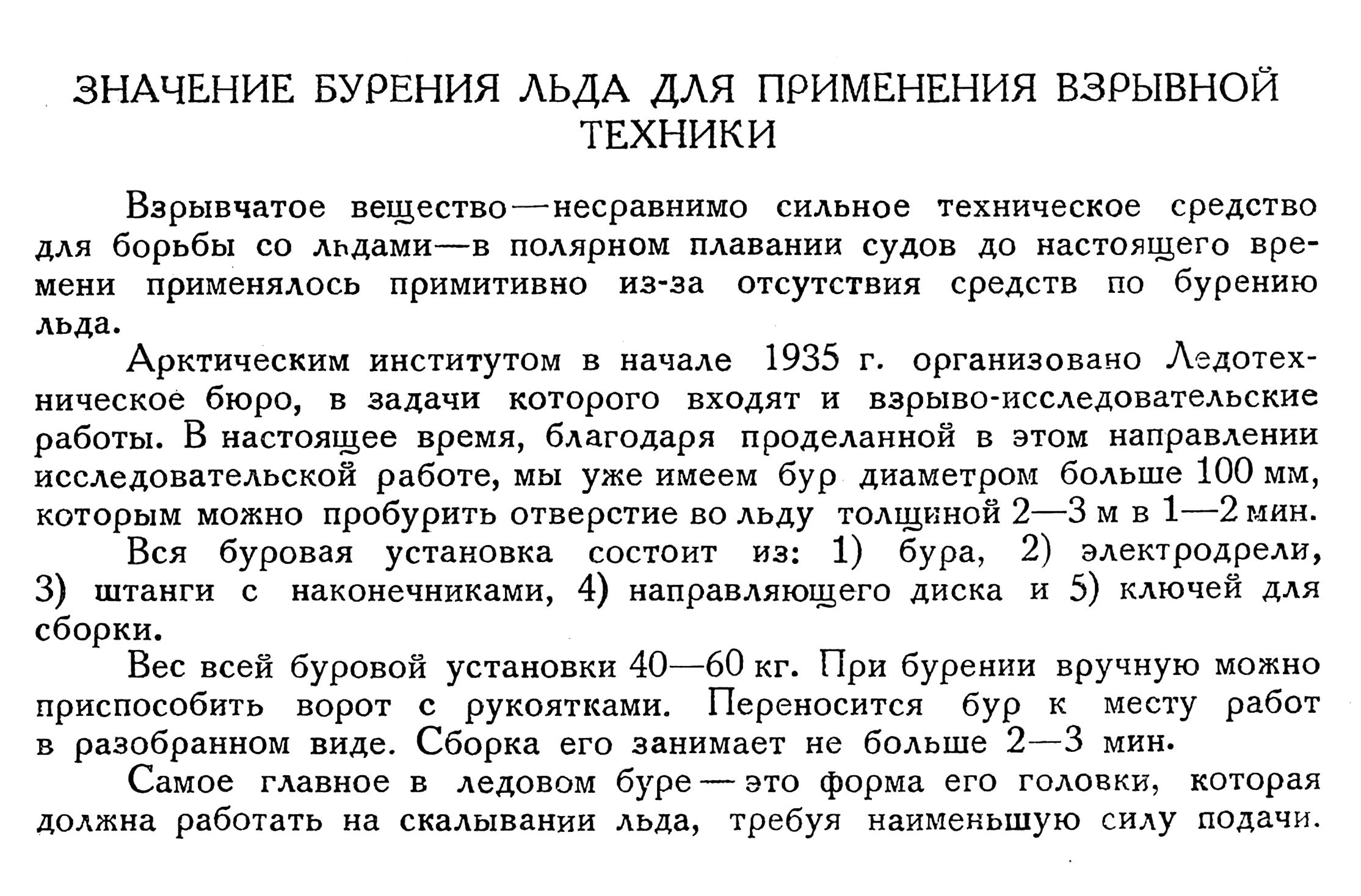 Арктическим институтом в начале 1935 г. организовано Ледотехническое бюро, в задачи которого входят и взрыво-исследовательские работы. В настоящее время, благодаря проделанной в этом направлении исследовательской работе, мы уже имеем бур диаметром больше 100 мм, которым можно пробурить отверстие во льду толщиной 2—3 м в 1—2 мин.