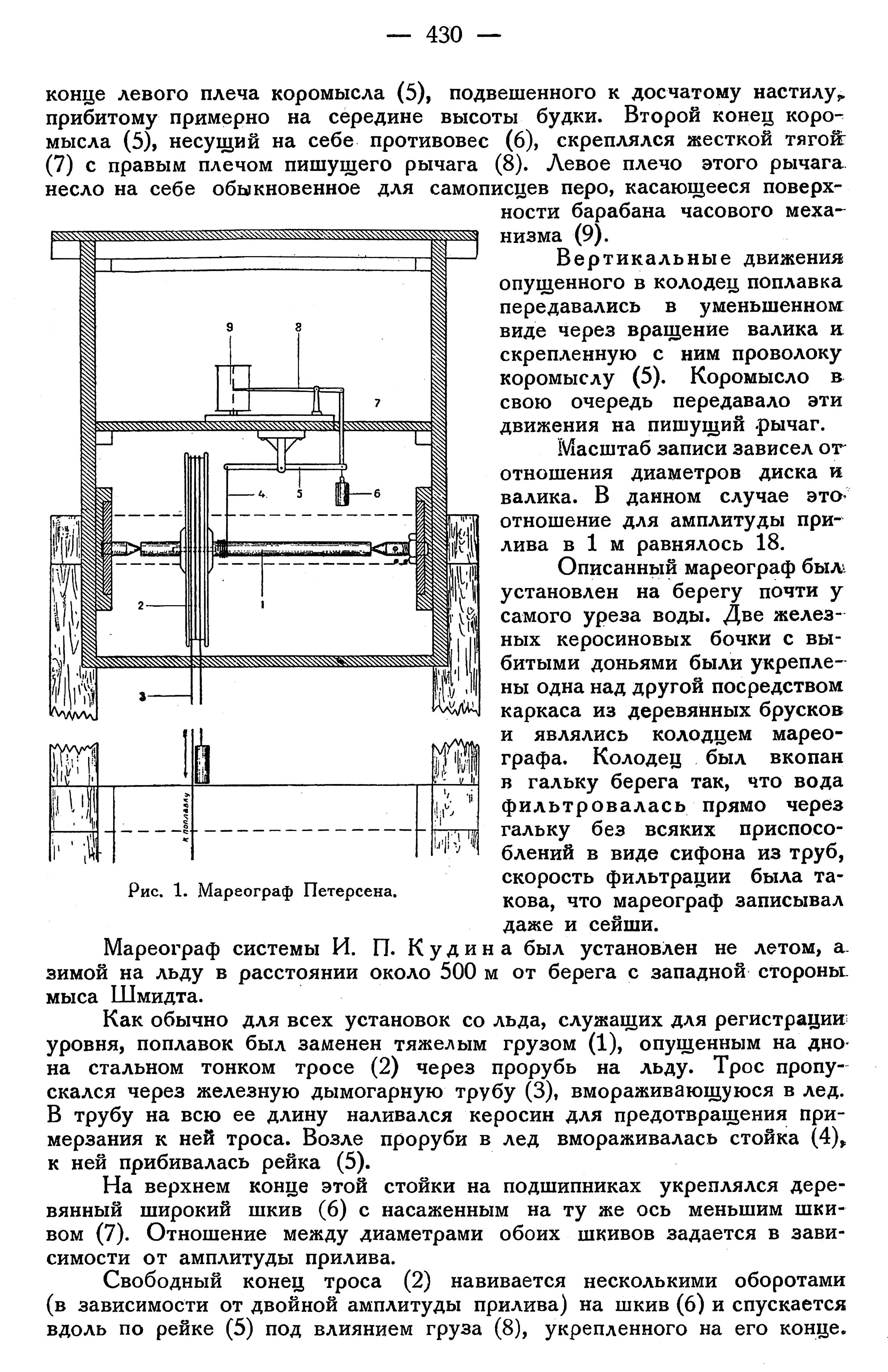 Описанный мареограф был установлен на берегу почти у самого уреза воды. Две железных керосиновых бочки с выбитыми доньями были укреплены одна над другой посредством каркаса из деревянных брусков и являлись колодцем мареографа. Колодец был вкопан в гальку берега так, что вода фильтровалась прямо через гальку без всяких приспособлений в виде сифона из труб, скорость фильтрации была такова, что мареограф записывал даже и сейши.