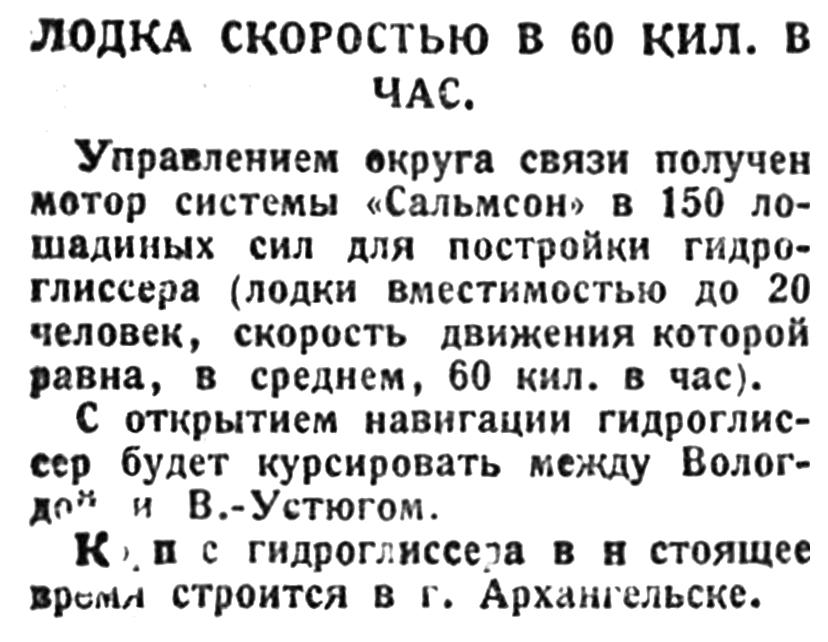 оригинальной конструкции, в полном смысле скользящей по поверхности воды моторной лодки, названной французами— L. hydroglisseur, что в переводе на русский язык означает: гидроскользитель.
