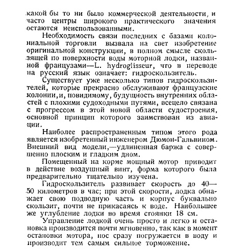 Существует уже несколько типов гидроскользителей, которые прекрасно обслуживают французские колонии,и, повидимому, будущность внутренних областей с плохими судоходными путями, всецело связана с прогрессом в этой новой области судостроения,основной принцип которого заимствован из авиации.