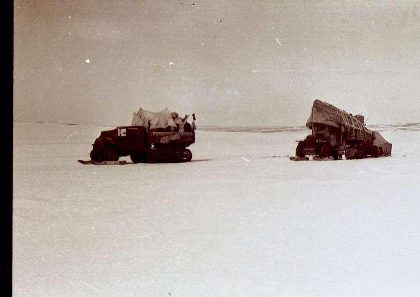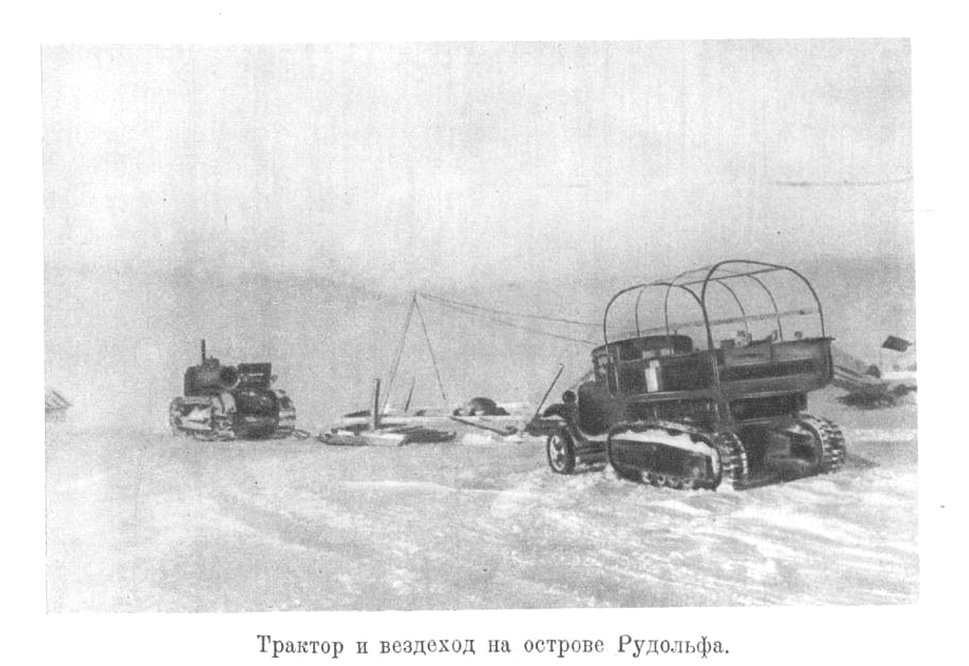 В апреле текущего года Начальник научной части зимовочной базы на о. Самуила Н. Н. Урванцев совершил переход от о-вов Самуила через Таймырский п-ов к мысу Челюскина и обратно на двух вездеходах. По поводу этого первого опыта применения вездехода в Арктике Н. Н. Урванцев сообщает в радиограмме Арктическому институту следующее.
