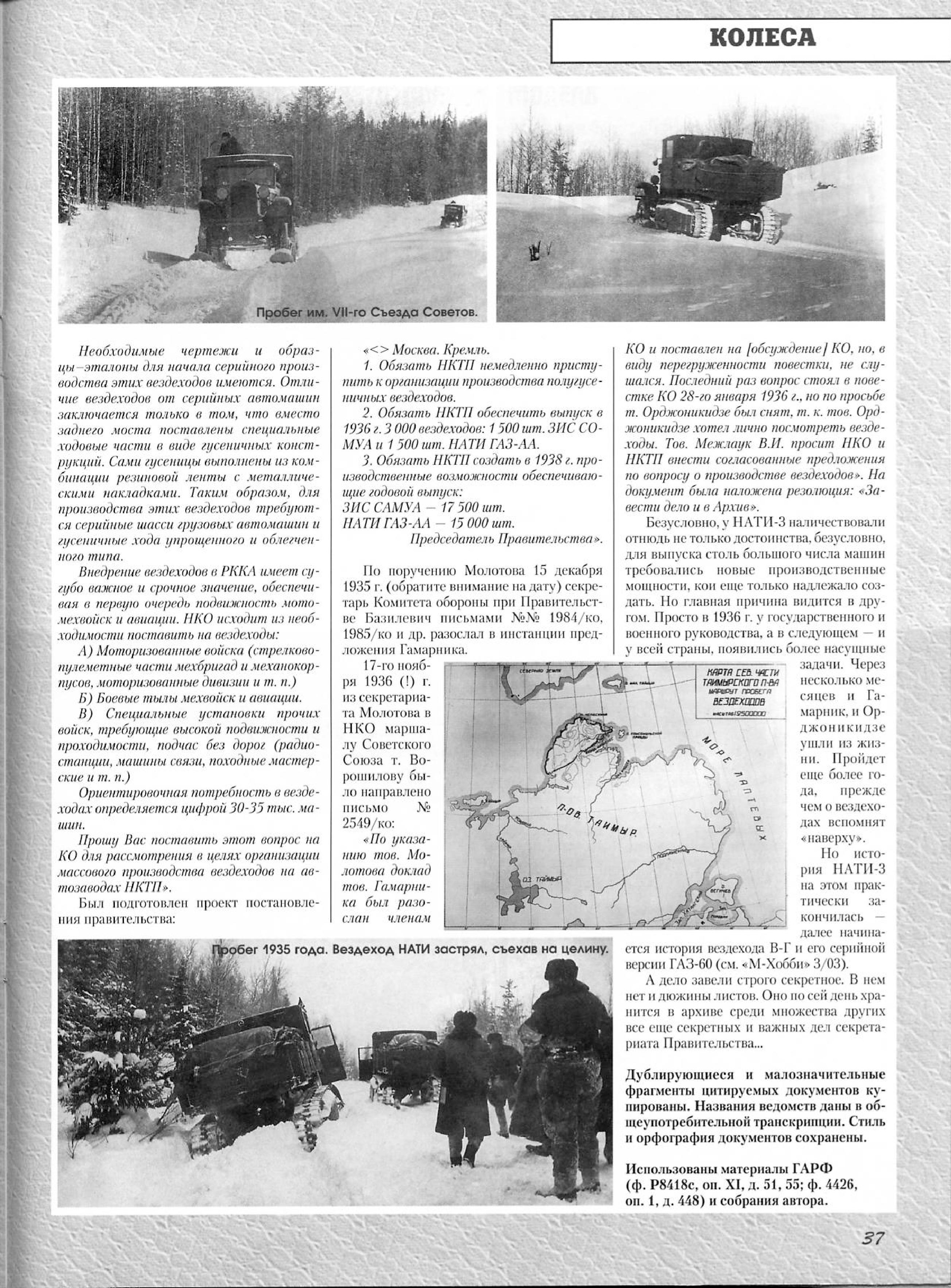 В данное время работы по созданию и испытанию образцов <> вездеходов на шасси ГАЗ-АА и ЗИС-5 закончены и дали вполне удовлетворительные результаты. Кроме того, ряд образцов на шасси ГАЗ-АА находились в продолжительной эксплуатации на севере Союза. Последний наиболее усовершенствованный образец успешно закончил пробег вездеходных снежных машин Москва — Архангельск — Москва.