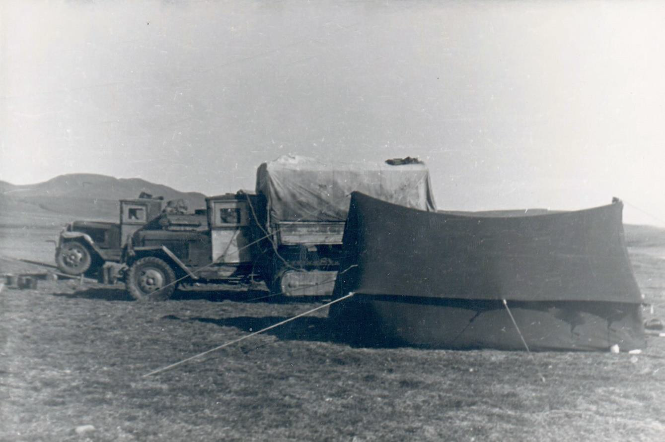 Лагерь геологической партии А.Б. Алексеевой. В качестве транспорта использовались легендарные вездеходы на базе ЗИС-5, на которых работал Н.Н. Урванцев.