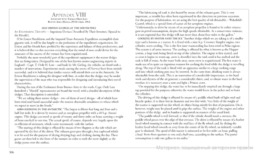 Качество наипаскуднейшее, но разобрать можно. Статья (это приложение к книге) была опубликована в "Буэнос-Айрес Геральд", 29 октября 1914 года. "Самодвижущиеся сани на Южном полюсе", "Инженерный триумф - замечательные устройства, описанные их изобретателем (специально для Геральд)". Перевод сделать? :oops: