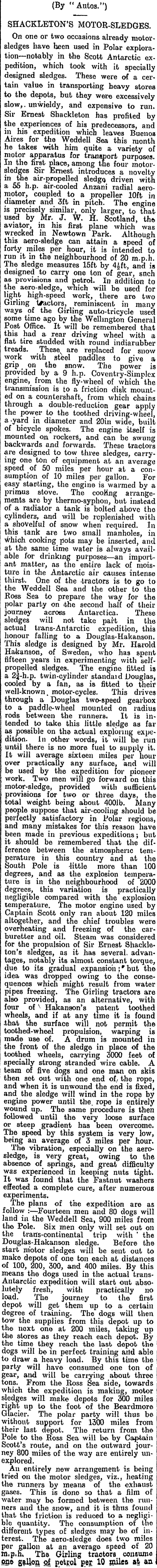 Возможно, наиболее чудесная часть экспедиционного оборудования – это взятые в экспедицию моторные сани. Сконструированные одним из самых выдающихся инженерных экспертов Англии – капитаном Томасом Х. Орде-Лииз, и построенные на заводе Гирлинг, эти машины отличаются целым рядом новшеств. Опыты, проведенные в снегах Норвегии, оказались полностью успешными, и можно ожидать, что аналогичный успех ждет их в Антарктиде. Сэр Эрнест Шэклтон взял их конструктора с собой, чтобы сани находились под постоянным наблюдением ответственного за их создание и все новшества.