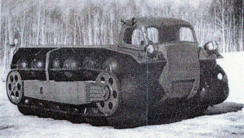 Вездеход ЗиЛ ПКУ-1 или ПКТс-1. Прототип пневмогусеничного катка был разработан в 1965 году. Передвигался на перекатывающихся пневмобаллонах, собранных в гусеницы. Мог перевозить 1,5 т груза и отлично преодолевал заснеженную и болотистую местность. Машина развивала максимальную скорость в 18 км/час. Видео он-лайн - http://autohis.ru/sovietauto/zil/zil-pku-1.php
