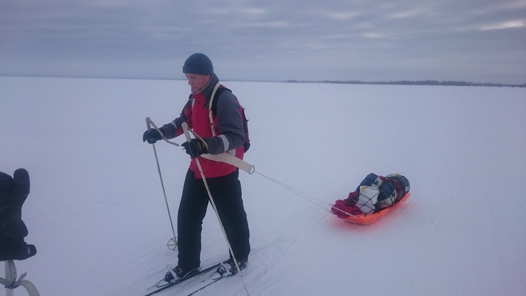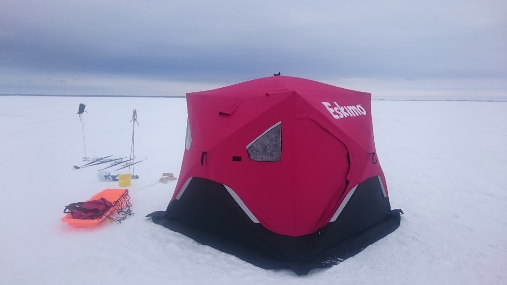 Конечно не КАПШ, но довольно неплохая утепленная палатка, проектировалась для рыбаков, но вполне пригодная для дневного забора проб батиметром и установки буйковых станций на льду. Довольно легкая, так что убирается в санку, которую может вполне тянуть лыжник.