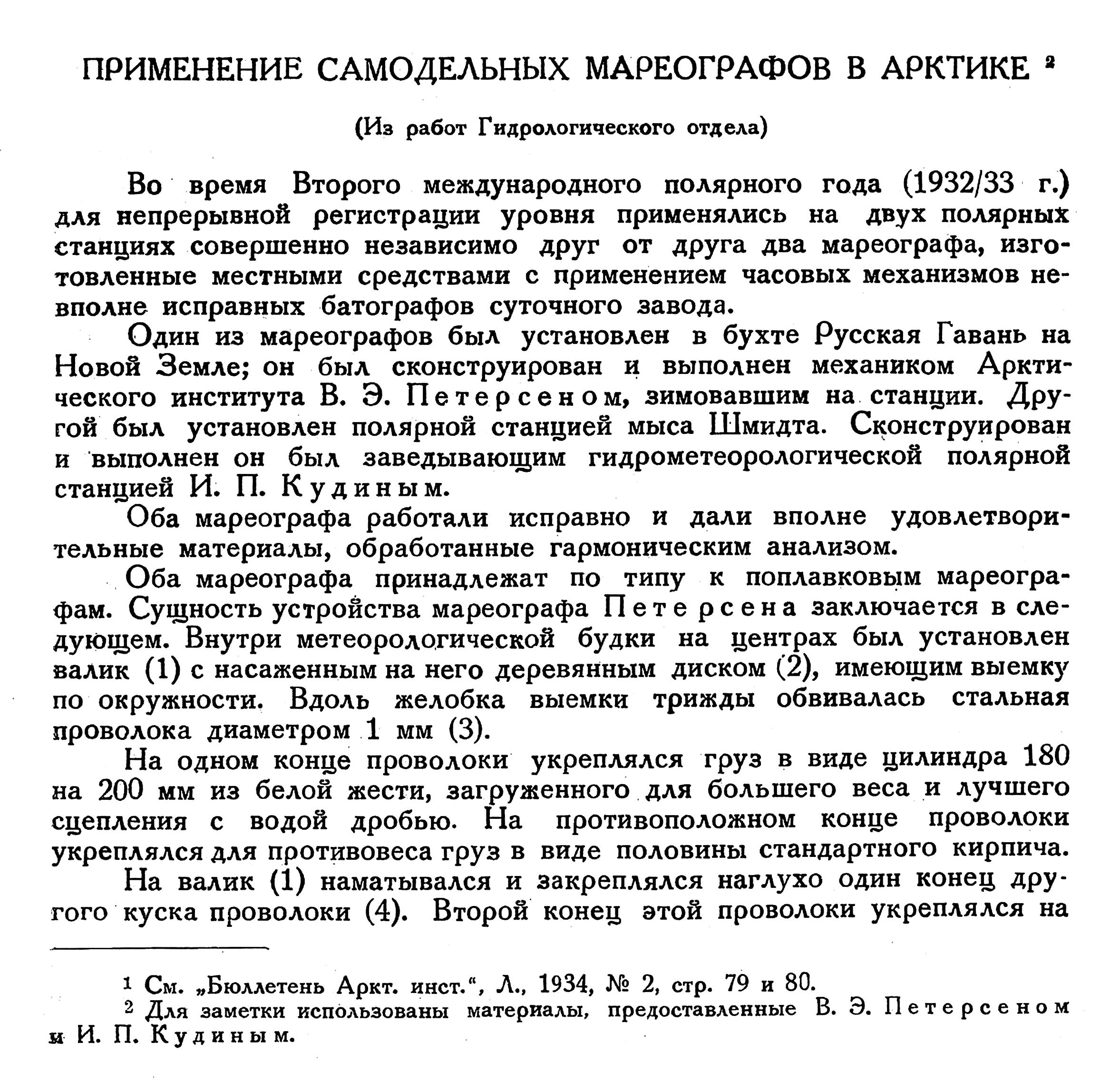 Во время Второго международного полярного года (1932/33 г. ) для непрерывной регистрации уровня применялись на двух полярных станциях совершенно независимо друг от друга два мареографа, изготовленные местными средствами с применением часовых механизмов невполне исправных батографов суточного завода.