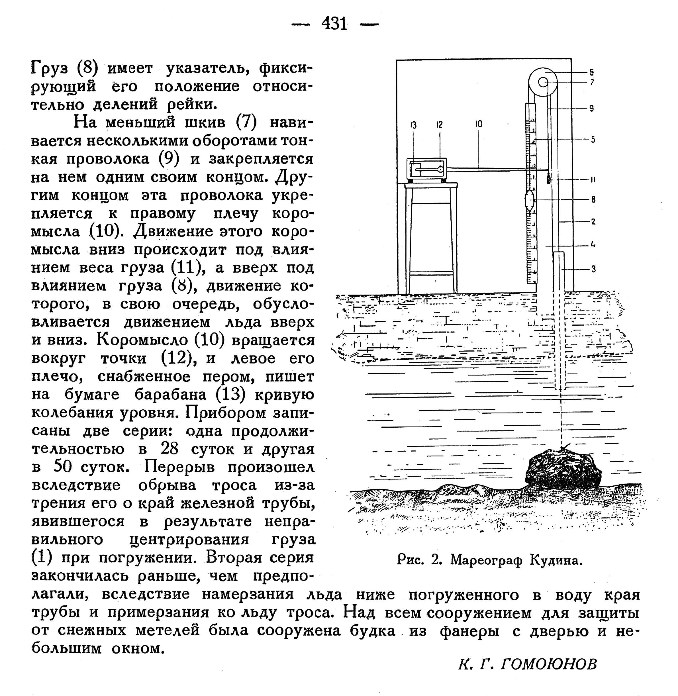 На меньший шкив (7) навивается несколькими оборотами тонкая проволока (9) и закрепляется на нем одним своим концом. Другим концом эта проволока укрепляется к правому плечу коромысла (10). Движение этого коромысла вниз происходит под влиянием веса груза (11), а вверх под влиянием груза (8), движение которого, в свою очередь, обусловливается движением льда вверх и вниз. Коромысло (10) вращается вокруг точки (12), и левое его плечо, снабженное пером, пишет на бумаге барабана (13) кривую колебания уровня. Прибором записаны две серии: одна продолжительностью в 28 суток и другая в 50 суток. Перерыв произошел вследствие обрыва троса из-за трения его о край железной трубы, явившегося в результате неправильного центрирования груза (1) при погружении. Вторая серия закончилась раньше, чем предполагали, вследствие намерзания льда ниже погруженного в воду края трубы и примерзания ко льду троса. Над всем сооружением для защиты от снежных метелей была сооружена будка из фанеры с дверью и небольшим окном.