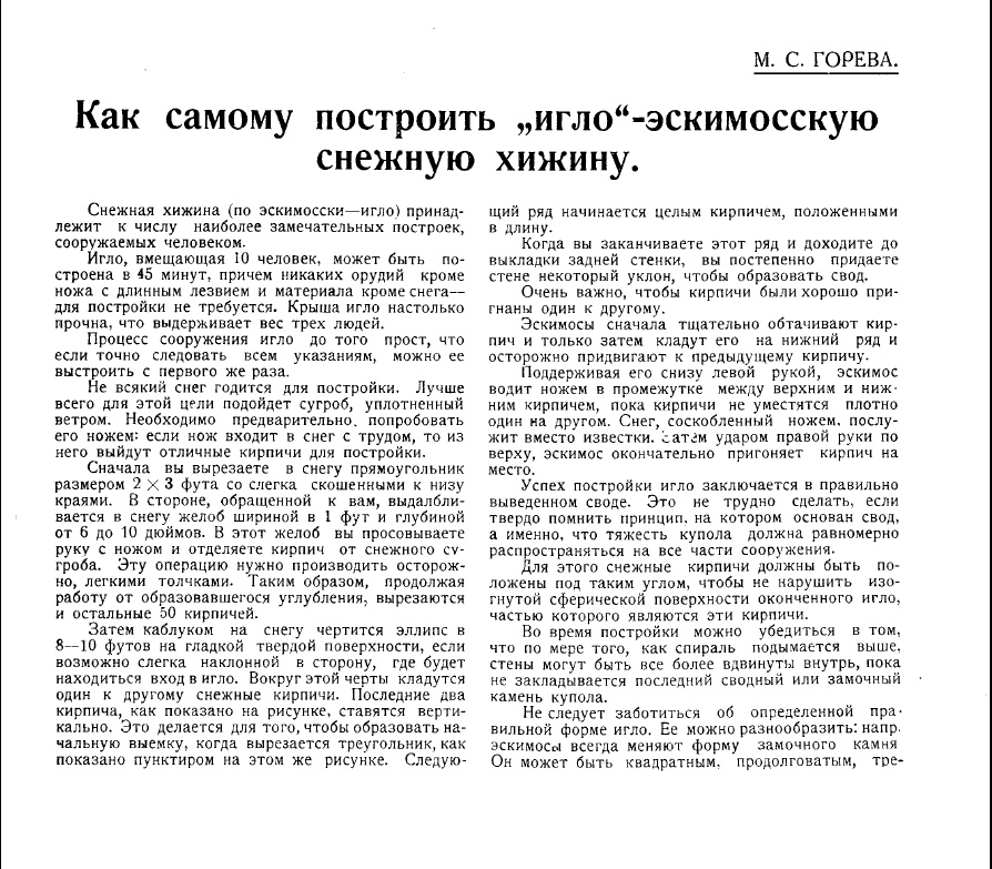 Горева М.С.Как самому построить „игло“-эскимосскую снежную хижину// Вестник знания 1926 №3 с.213-216