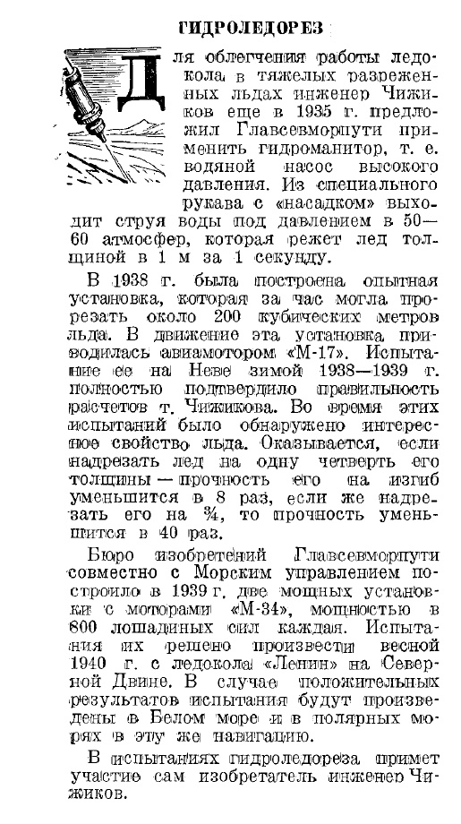 Чижиков В. Гидроледорез // Техника – молодѐжи. 1946. № 4. С. 4–5.