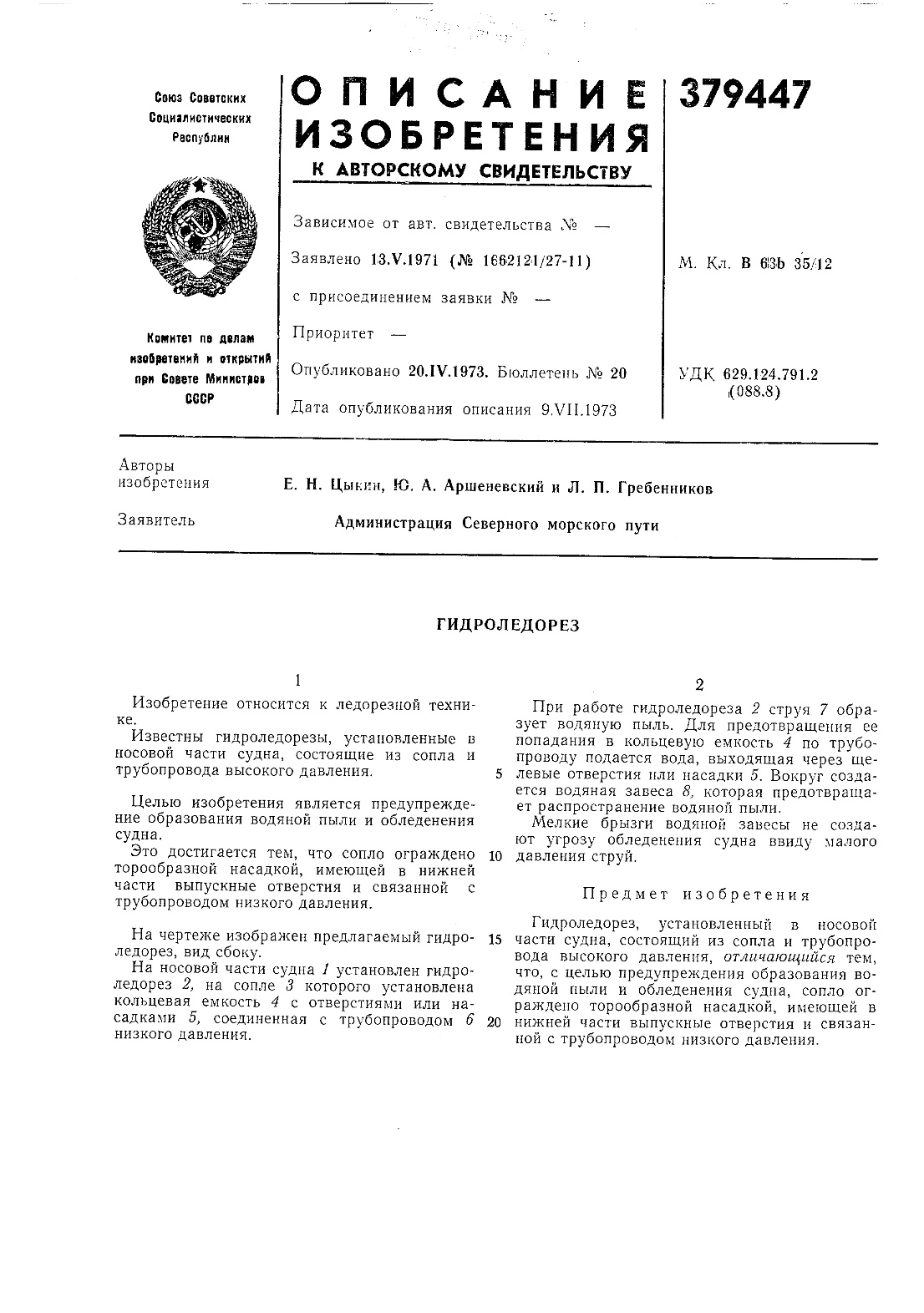 Патент «Гидроледорез», заявителя Аршеневский Ю.А., Гребенников Л.П., Цыкин Е.Н.