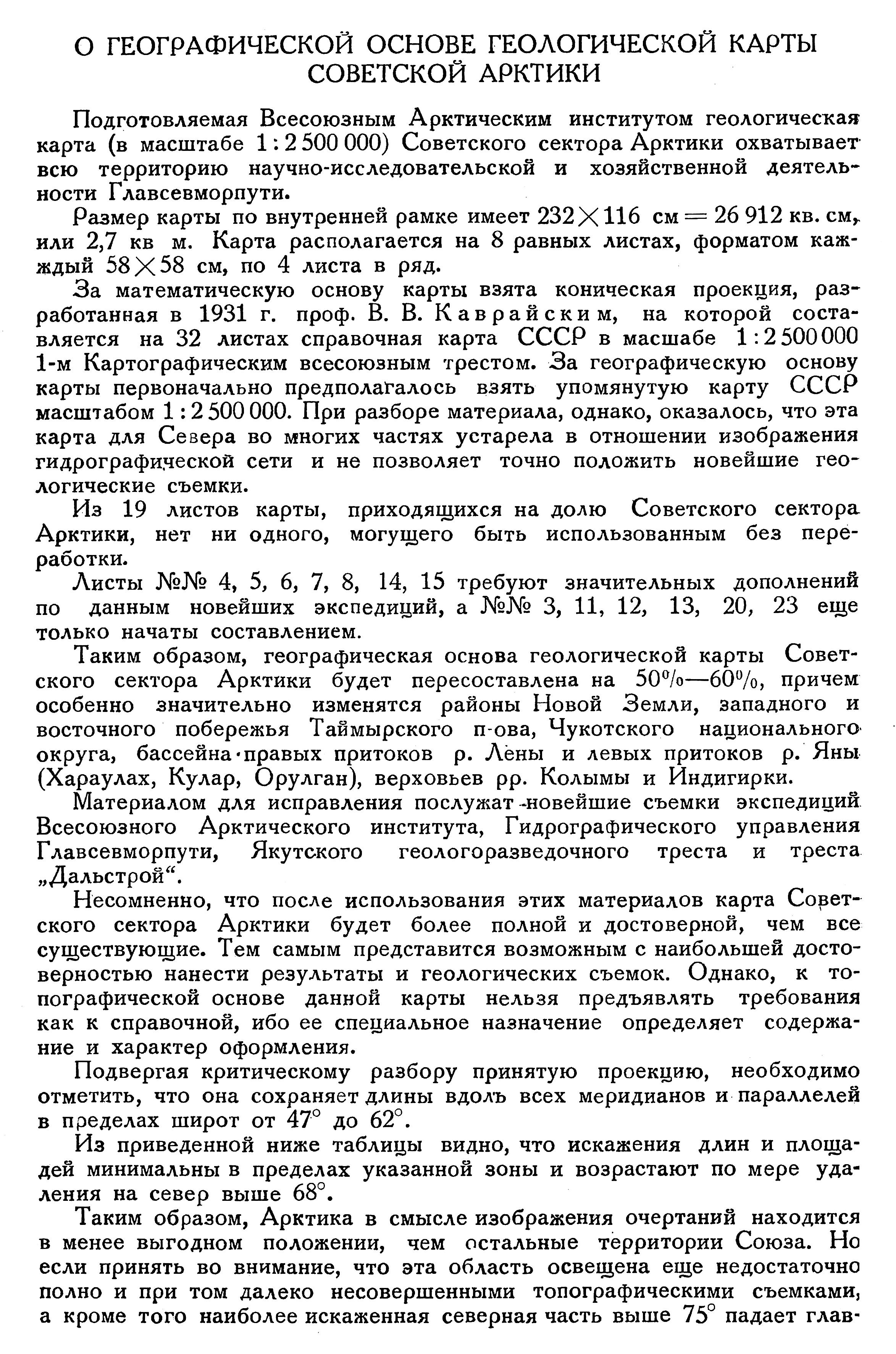 Общая площадь материковой части Советского Севера, считая границей пределы работ Главсевморпути, т. е. 62° с. ш., достигает согласно новейших подсчетов 5,5 млн. кв. км. На полярные земли и острова падает 0,2 млн. кв. км, а всего площадь суши Советского Севера достигает 5,7 млн. кв. км. Из них геологически изучено настолько, чтобы иметь возможность составить карту масштаба 1:1 000 000, не более 0,30 млн. кв. км, или 5%. Остальное покрыто сетью маршрутов, местами до такой степени редких, что они отстоят друг от друга на 400—500 км. Это допускает для отдельных районов составление лишь карт масштаба 1:2 500 000, 1:4 000 000 и мельче. Местами же нет материала даже и для таких мелкомасштабных карт. Между тем задачи промышленного освоения Арктики требуют геологической карты в масштабе не мельче 1:1 000 000 целых областей, для отдельных наиболее перспективных районов 1:200 000 и крупнее, так как только такой масштаб допускает планирование и ведение поисково-разведочных работ хотя бы самого мелкого рекогносцировочного типа. На съемку всей территории Советской Арктики за вычетом снятого потребуется много времени и большая затрата сил и средств.