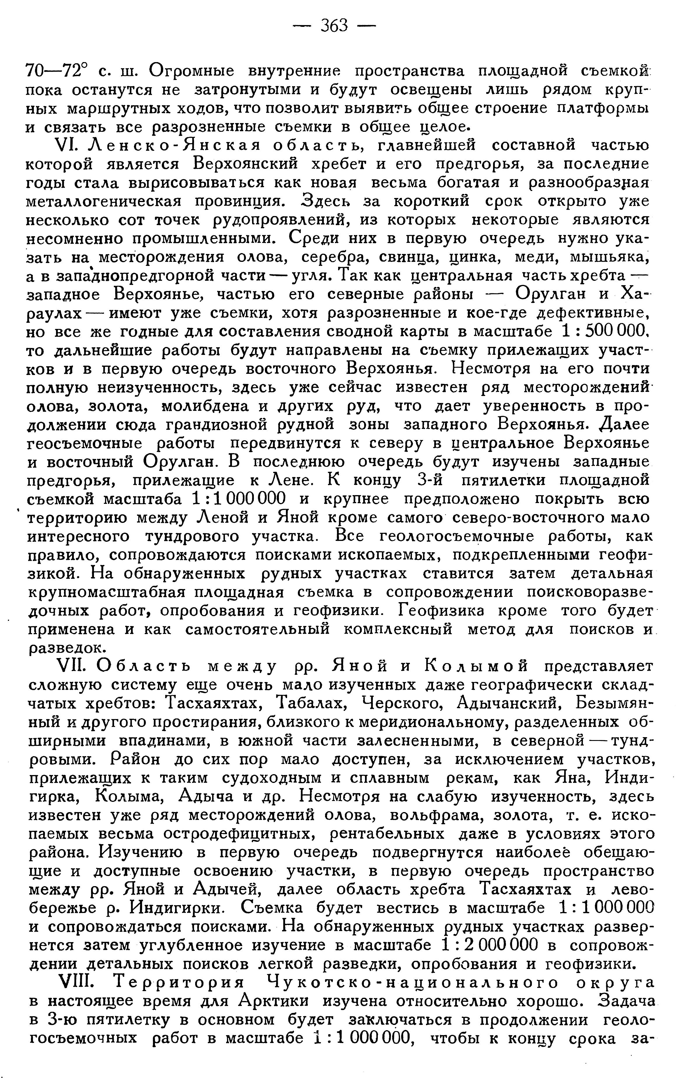 Ленско-Янская область, главнейшей составной частью которой является Верхоянский хребет и его предгорья, за последние годы стала вырисовываться как новая весьма богатая и разнообразная металлогеническая провинция. Здесь за короткий срок открыто уже несколько сот точек рудопроявлений, из которых некоторые являются несомненно промышленными. Среди них в первую очередь нужно указать на месторождения олова, серебра, свинца, цинка, меди, мышьяка, а в западнопредгорной части — угля. Так как центральная часть хребта — западное Верхоянье, частью его северные районы — Орулган и Хараулах — имеют уже съемки, хотя разрозненные и кое-где дефективные, но все же годные для составления сводной карты в масштабе 1: 500 000, то дальнейшие работы будут направлены на съемку прилежащих участков и в первую очередь восточного Верхоянья. Несмотря на его почти полную неизученность, здесь уже сейчас известен ряд месторождений олова, золота, молибдена и других руд, что дает уверенность в продолжении сюда грандиозной рудной зоны западного Верхоянья. Далее геосъемочные работы передвинутся к северу в центральное Верхоянье и восточный Орулган. В последнюю очередь будут изучены западные предгорья, прилежащие к Лене. К концу 3-й пятилетки площадной съемкой масштаба 1:1 000 000 и крупнее предположено покрыть всю территорию между Леной и Яной кроме самого северо-восточного мало интересного тундрового участка. Все геологосъемочные работы, как правило, сопровождаются поисками ископаемых, подкрепленными геофизикой. На обнаруженных рудных участках ставится затем детальная крупномасштабная площадная съемка в сопровождении поисковоразведочных работ, опробования и геофизики. Геофизика кроме того будет применена и как самостоятельный комплексный метод для поисков и разведок.