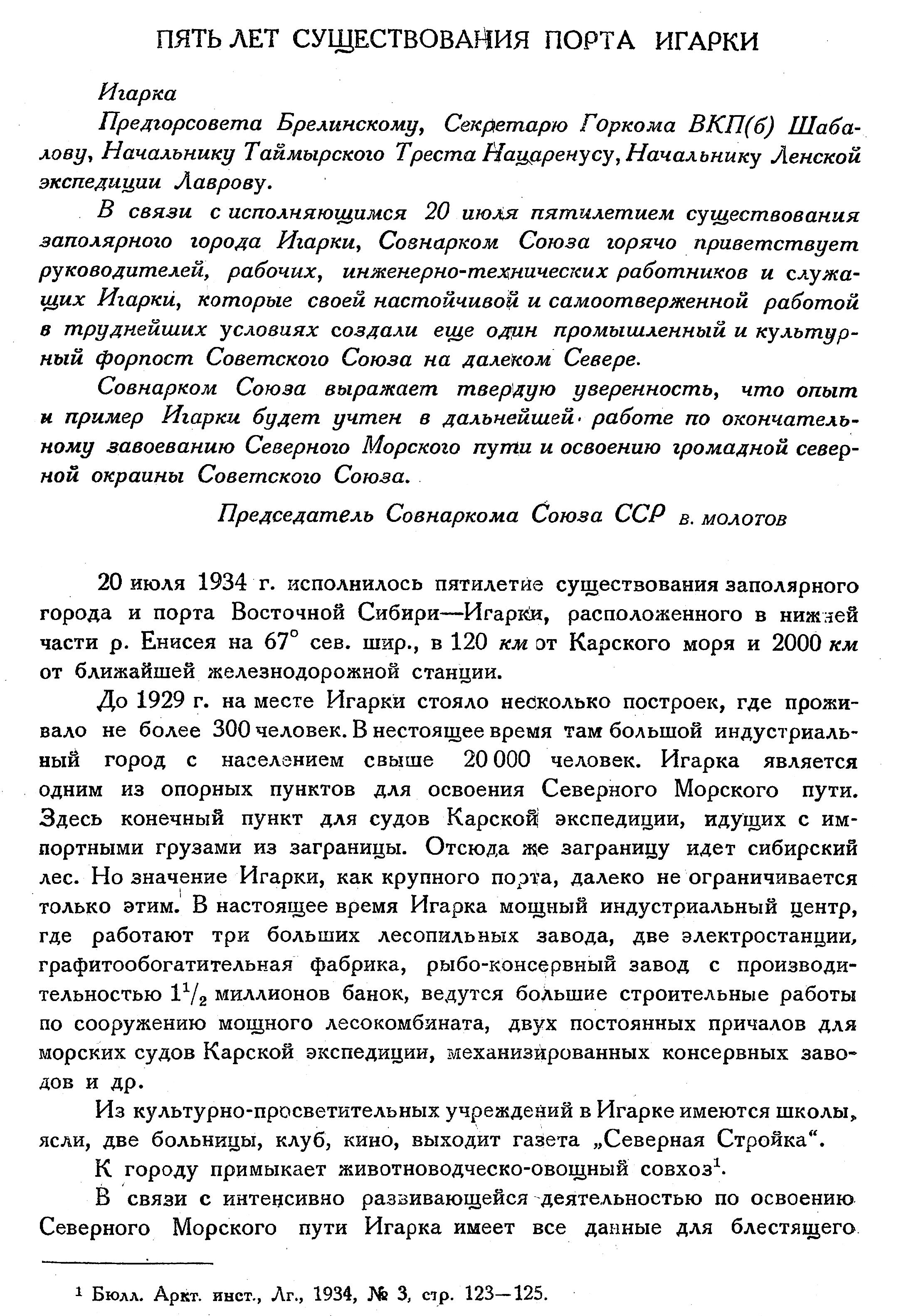 В связи с исполняющимся 20 июля пятилетием существования заполярного города Игарки, Совнарком Союза горячо приветствует руководителей, рабочих, инженерно-технических работников и служащих Игарки, которые своей настойчивой и самоотверженной работой в труднейших условиях создали еще один промышленный и культурный форпост Советского Союза на далеком Севере.
