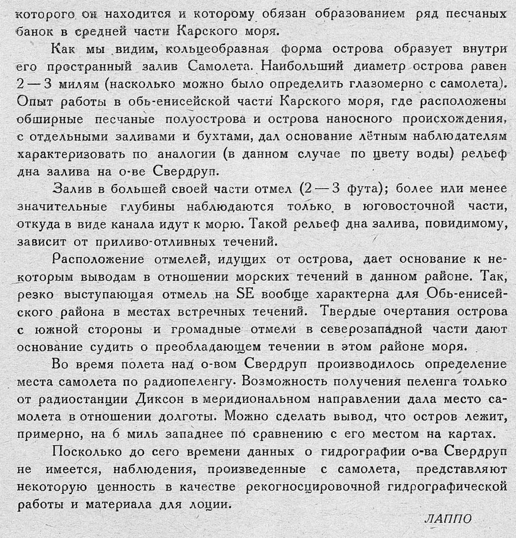 Лаппо, {2} совершавшего ледовую разведку на самолете "Комсеверпуть №3" в 1931 г. При этих разведках самолет дважды проходил над о-вом Свердруп. Во время полетов 29 июня и 8 августа
