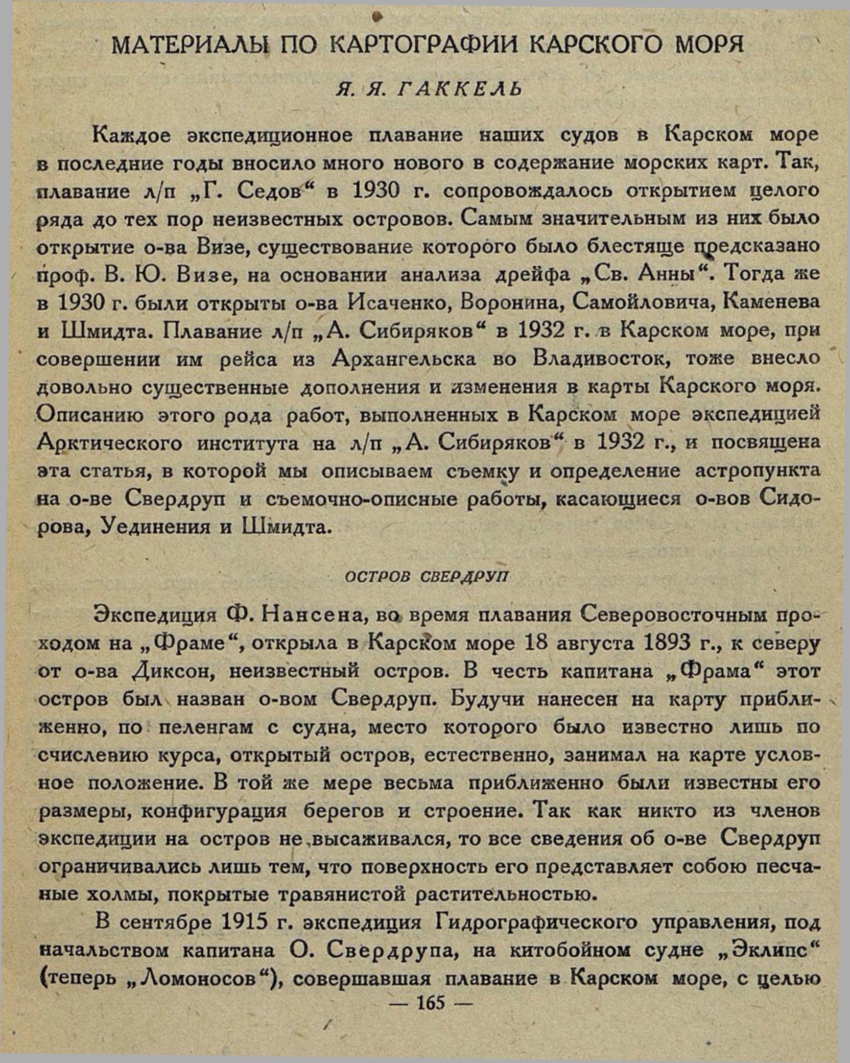 Экспедиция Ф. Нансена, во время плавания Северовосточным проходом на "Фраме", открыла в Карском море 18 августа 1893 г., к северу от о-ва Диксон, неизвестный остров. В честь капитана "Фрама" этот остров был назван о-вом Свердруп. Будучи нанесен на карту приближенно, по пеленгам с судна, место которого было известно лишь по счислению курса, открытый остров, естественно, занимал на карте услов¬ное положение. В той же мере весьма приближенно были известны его размеры, конфигурация берегов и строение. Так как никто из членов экспедиции на остров не высаживался, то все сведения об о-ве Свердруп ограничивались лишь тем, что поверхность его представляет собою песчаные холмы, покрытые травянистой растительностью.
