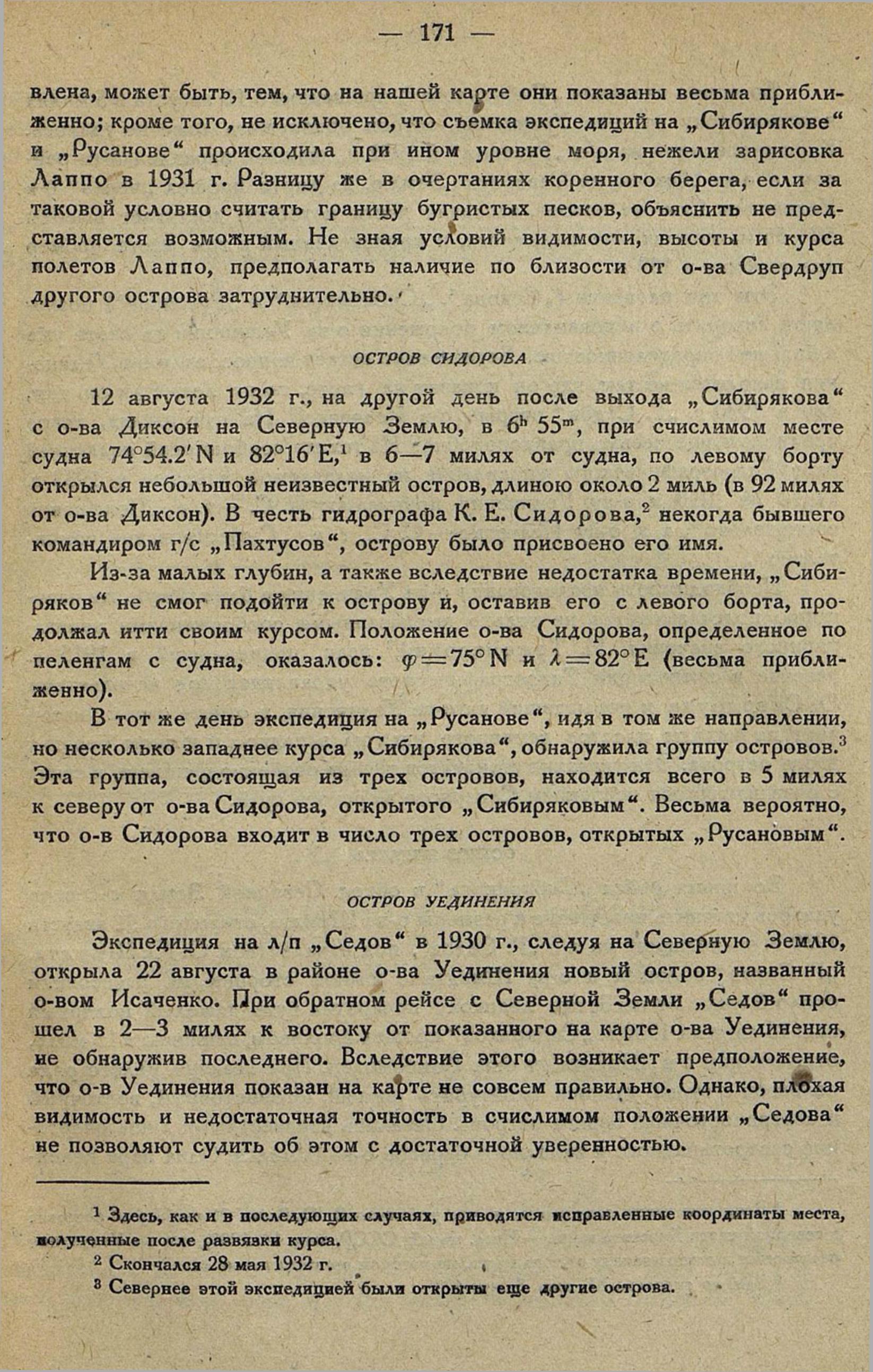 {1} Возможно также допущение, на что указывает В. Ю. Визе (К вопросу об островах в северной части Карского моря. — Иссл. морей СССР, вып. 14, 1931), что о-в Уединения расположен к северо-западу от того места, на котором он значится на карте.