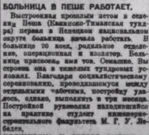 Выстроенная прошлым летом в селении Пеша (Канинско-Тиманская тундра) первая в Ненецком национальном округе больница начала работать. В больнице 20 коек, родильное отделение, операционная и изолятор. Больнице присвоено имя тов. Семашко. Выстроена она в тяжелых тундровых условиях. Благодаря социалистическому соревнованию, проводившемуся между отдельными рабочими, постройку удалось, однако, выполнить в три месяца. Постройкой руководил находившийся на практике студент инженерно-строительного факультета М.Г.У. Лебедев.