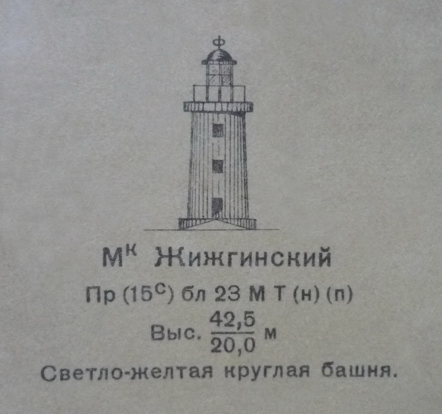 Остров Жижгинский, на котором установлен маяк, лежит в 2,5 мили от северо-западной оконечности Летнего берега Белого моря. Длина острова с северо-востока на юго-запад 2 мили, а ширина около мили.