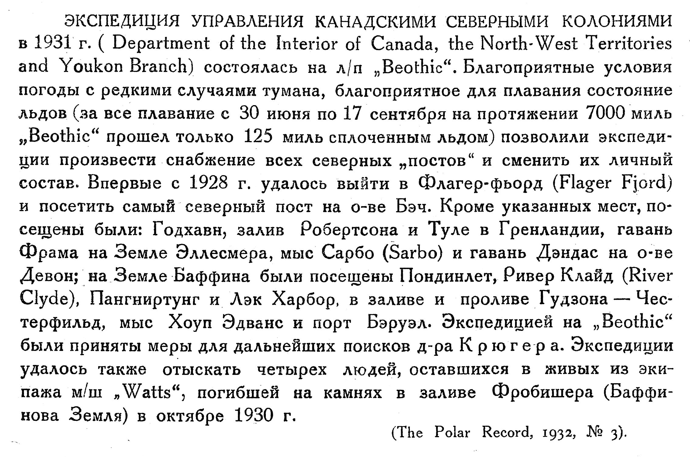 ЭКСПЕДИЦИЯ УПРАВЛЕНИЯ КАНАДСКИМИ СЕВЕРНЫМИ КОЛОНИЯМИ в 1931 г. ( Department of the Interior of Canada, the North-West Territories and Youkon Branch) состоялась на л/п „Beothic“. Благоприятные условия погоды с редкими случаями тумана, благоприятное для плавания состояние льдов (за все плавание с 30 июня по 17 сентября на протяжении 7000 миль „Beothic“ прошел только 125 миль сплоченным льдом) позволили экспедиции произвести снабжение всех северных „постов" и сменить их личный состав. Впервые с 1928 г. удалось выйти в Флагер-фьорд (Flager Fjord) и посетить самый северный пост на о-ве Бэч. Кроме указанных мест, посещены были: Годхавн, залив Робертсона и Туле в Гренландии, гавань Фрама на Земле Эллесмера, мыс Сарбо (Sarbo) и гавань Дэндас на о-ве Девон; на Земле Баффина были посещены Пондинлет, Ривер Клайд (River Clyde), Пангниртунг и Лэк Харбор, в заливе и проливе Гудзона — Честерфильд, мыс Хоуп Эдванс и порт Бэруэл. Экспедицией на ,,Beothic“ были приняты меры для дальнейших поисков д-ра Крюгера. Экспедиции удалось также отыскать четырех людей, оставшихся в живых из экипажа м/ш „Watts", погибшей на камнях в заливе Фробишера (Баффинова Земля) в октябре 1930 г.