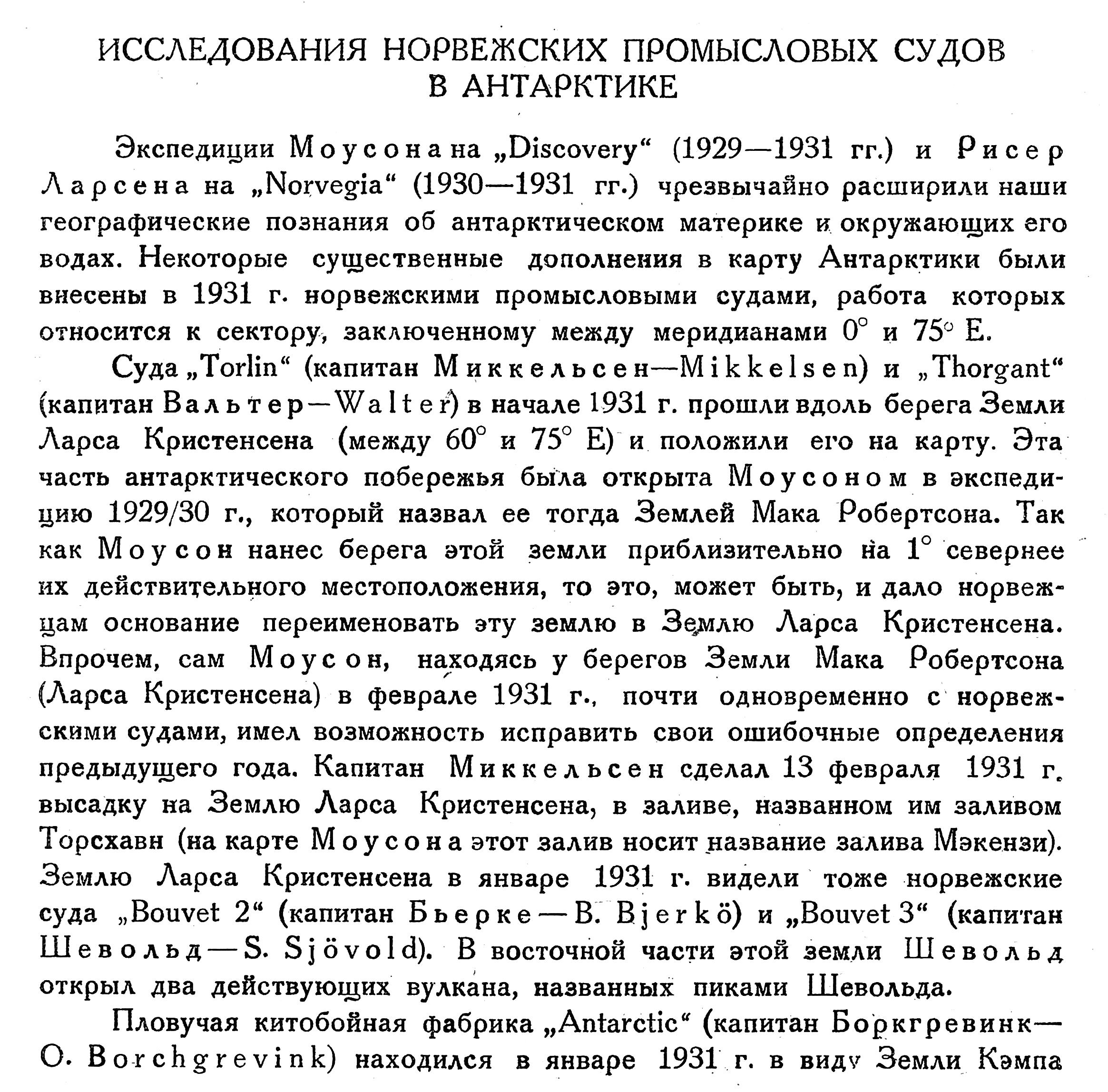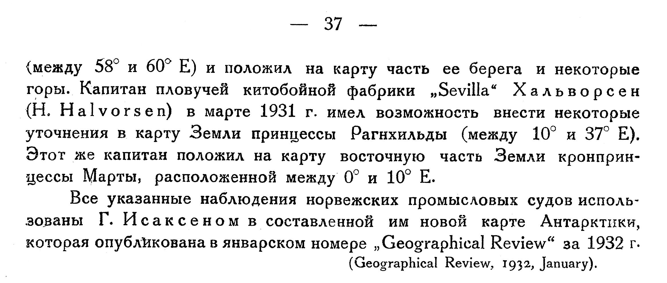 Все указанные наблюдения норвежских промысловых судов использованы Г. Исаксеном в составленной им новой карте Антарктики, которая опубликована в январском номере „Geographical Review" за 1932 г.