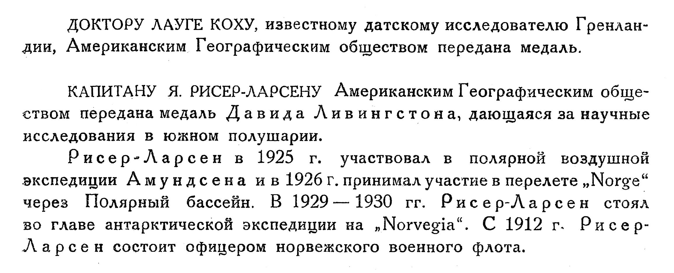 КАПИТАНУ Я. РИСЕР-ЛАРСЕНУ Американским Географическим обществом передана медаль Давида Ливингстона, дающаяся за научные исследования в южном полушарии.
