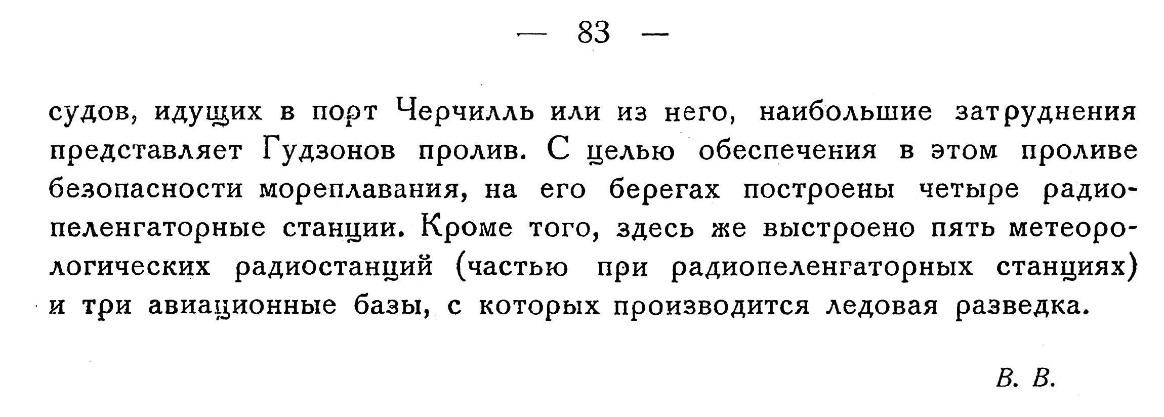Как известно, Канада устроила на западном берегу Гудзонова залива полярный морской порт Черчилль, соединив его железной дорогой с главными магистралями страны. В сентябре 1931 г. из порта Черчилль вышли в Англию два первых парохода (по 5000 тонн каждый) с грузом пшеницы. Порт Черчилль обслуживается одним большим ледоколом и одним малым, при помощи которых предполагается поддерживать навигацию с начала июля до середины ноября. В ледовом отношении для судов, идущих в порт Черчилль или из него, наибольшие затруднения представляет Гудзонов пролив. С целью обеспечения в этом проливе безопасности мореплавания, на его берегах построены четыре радиопеленгаторные станции. Кроме того, здесь же выстроено пять метеорологических радиостанций (частью при радиопеленгаторных станциях) и три авиационные базы, с которых производится ледовая разведка.