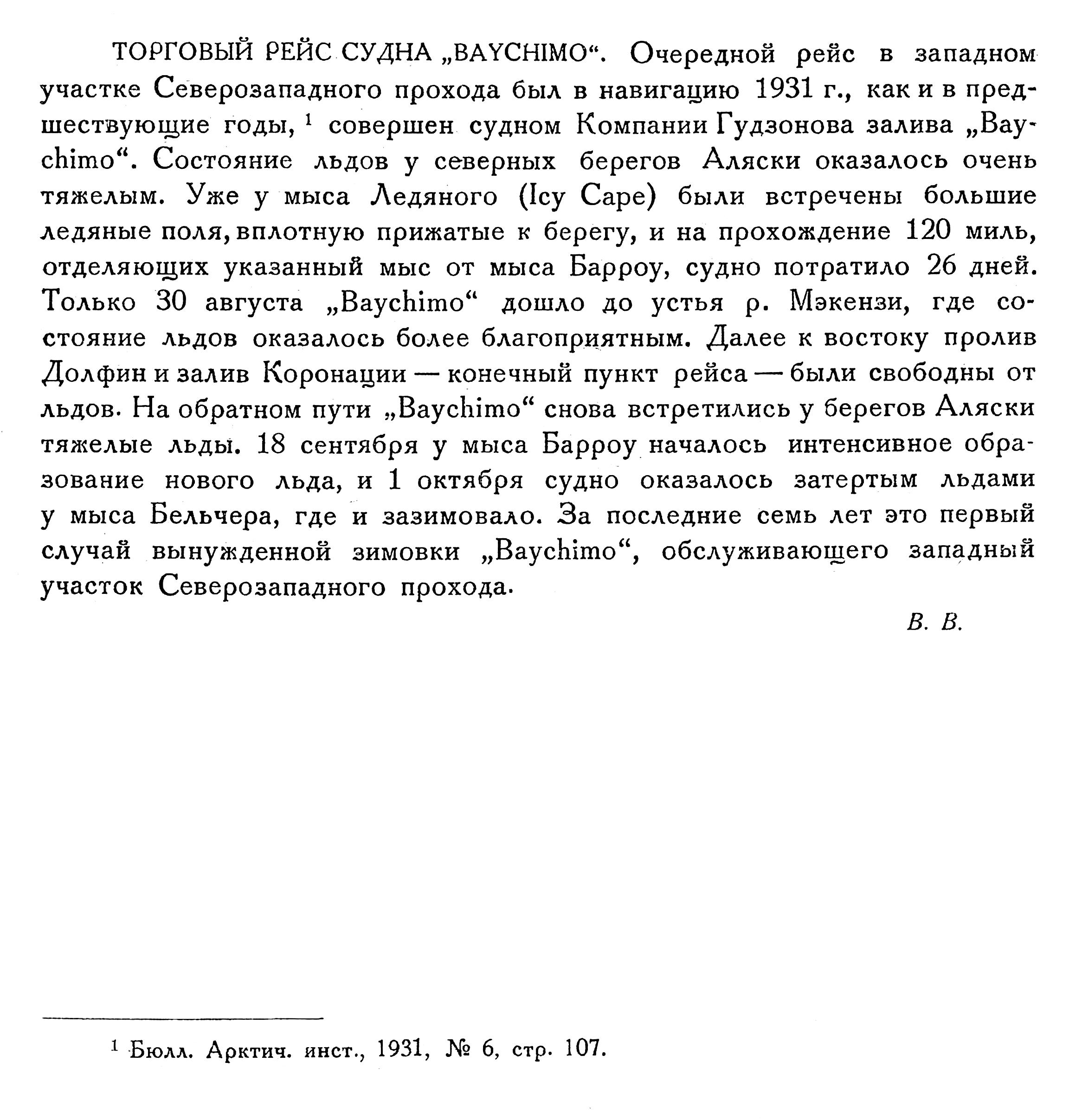 ТОРГОВЫЙ РЕЙС СУДНА „BAYCHIMO". Очередной рейс в западном участке Северозападного прохода был в навигацию 1931 г., как и в предшествующие годы, 1) совершен судном Компании Гудзонова залива „Вaychimo“. Состояние льдов у северных берегов Аляски оказалось очень тяжелым. Уже у мыса Ледяного (Icy Саре) были встречены большие ледяные поля, вплотную прижатые к берегу, и на прохождение 120 миль, отделяющих указанный мыс от мыса Барроу, судно потратило 26 дней. Только 30 августа „Baychimo" дошло до устья р. Мэкензи, где состояние льдов оказалось более благоприятным. Далее к востоку пролив Долфин и залив Коронации — конечный пункт рейса — были свободны от льдов. На обратном пути „Baychimo" снова встретились у берегов Аляски тяжелые льды. 18 сентября у мыса Барроу началось интенсивное образование нового льда, и 1 октября судно оказалось затертым льдами у мыса Бельчера, где и зазимовало. За последние семь лет это первый случай вынужденной зимовки „Baychimo", обслуживающего западный участок Северозападного прохода.