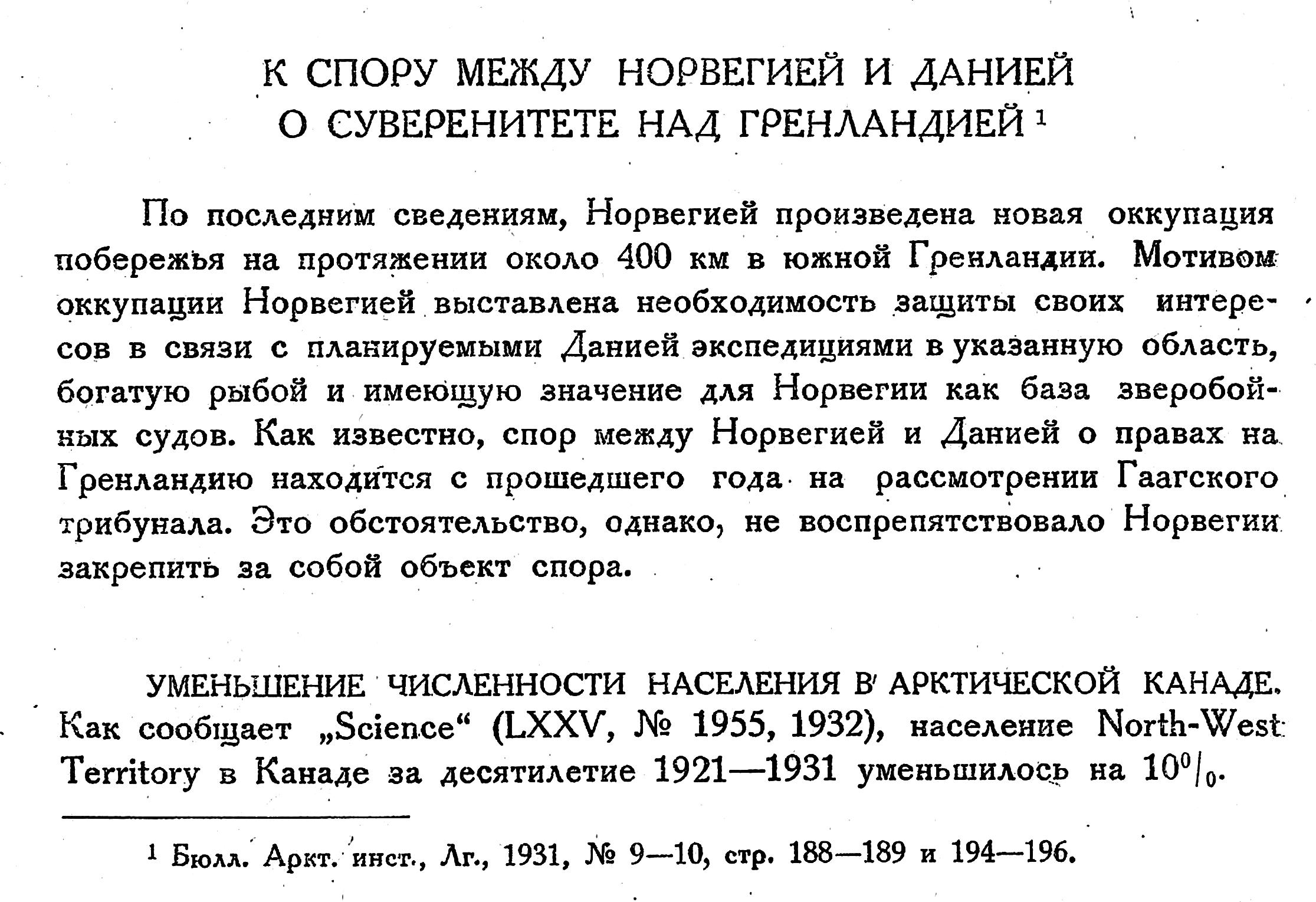 К СПОРУ МЕЖДУ НОРВЕГИЕЙ И ДАНИЕЙ О СУВЕРЕНИТЕТЕ НАД ГРЕНЛАНДИЕЙ 1)