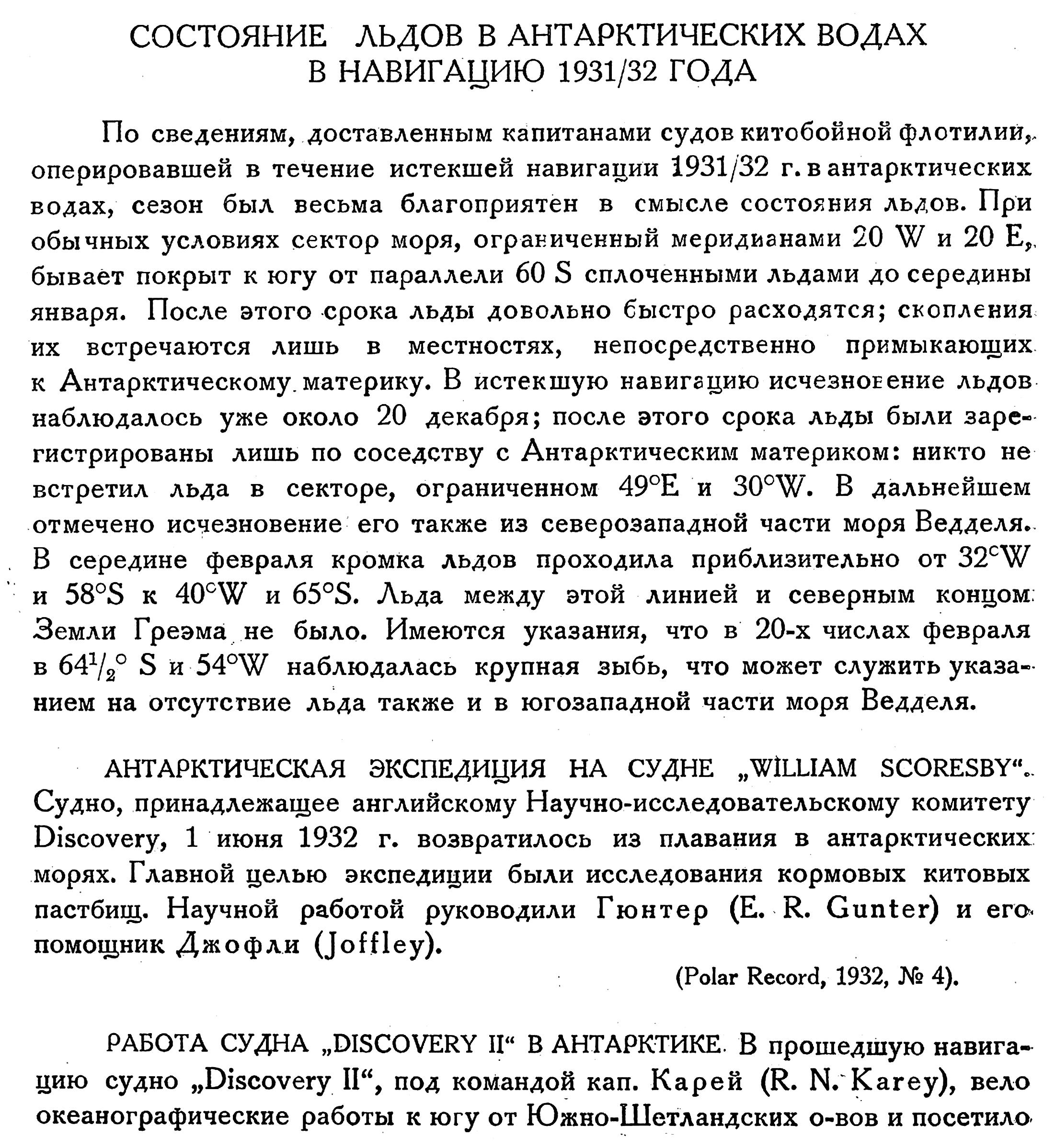 По сведениям, доставленным капитанами судов китобойной флотилий,, оперировавшей в течение истекшей навигации 1931/32 г. в антарктических водах, сезон был весьма благоприятен в смысле состояния льдов. При обычных условиях сектор моря, ограниченный меридианами 20 W и 20 Е, бывает покрыт к югу от параллели 60 S сплоченными льдами до середины января. После этого срока льды довольно быстро расходятся; скопления их встречаются лишь в местностях, непосредственно примыкающих к Антарктическому материку. В истекшую навигацию исчезновение льдов наблюдалось уже около 20 декабря; после этого срока льды были зарегистрированы лишь по соседству с Антарктическим материком: никто не встретил льда в секторе, ограниченном 49°Е и 30°W. В дальнейшем отмечено исчезновение его также из северозападной части моря Ведделя. В середине февраля кромка льдов проходила приблизительно от 32°˚W и 58°S к 40°W и 65°S. Льда между этой линией и северным концом: Земли Греэма не было. Имеются указания, что в 20-х числах февраля в 64 ½° S и 54°W наблюдалась крупная зыбь, что может служить указанием на отсутствие льда также и в югозападной части моря Ведделя.