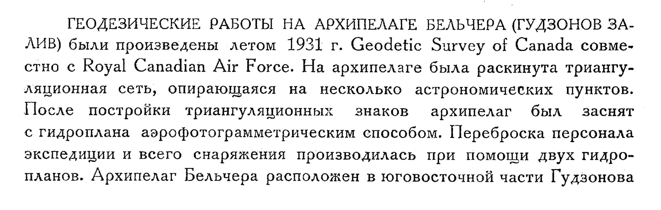 ГЕОДЕЗИЧЕСКИЕ РАБОТЫ НА АРХИПЕЛАГЕ БЕЛЬЧЕРА (ГУДЗОНОВ ЗАЛИВ) были произведены летом 1931 г. Geodetic Survey of Canada совместно c Royal Canadian Air Force. На архипелаге была раскинута триангуляционная сеть, опирающаяся на несколько астрономических пунктов. После постройки триангуляционных знаков архипелаг был заснят с гидроплана аэрофотограмметрическим способом. Переброска персонала экспедиции и всего снаряжения производилась при помощи двух гидропланов. Архипелаг Бельчера расположен в юговосточной части Гудзонова залива, в 60 милях от восточного берега его. На нем имеется постоянное население из 200 эскимосов. Есть указания о нахождении в северной части архипелага железной руды. Научно-исследовательская работа в области Гудзонова залива, прежде всего картирование этого обширного района, стимулируется в последние годы выходом железнодорожной сети к берегам Гудзонова залива и устройством на его западном берегу порта Черчилль.