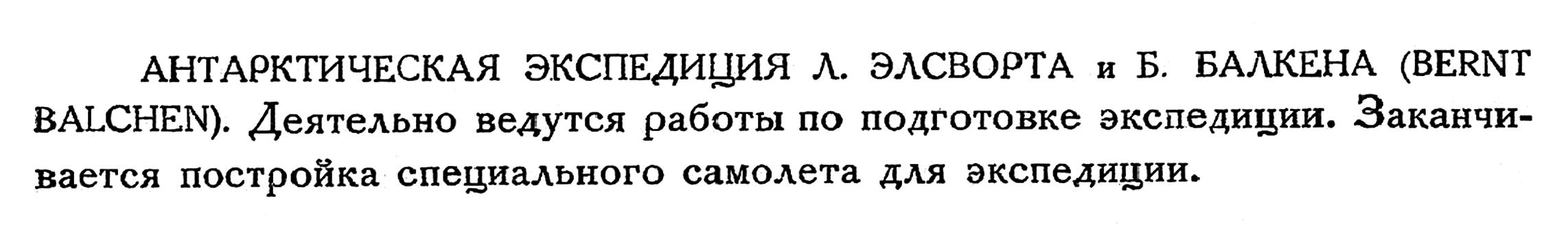 АНТАРКТИЧЕСКАЯ ЭКСПЕДИЦИЯ Л. ЭЛСВОРТА и Б. БАЛКЕНА (BERNT BALCHEN). Деятельно ведутся работы по подготовке экспедиции. Заканчивается постройка специального самолета для экспедиции.