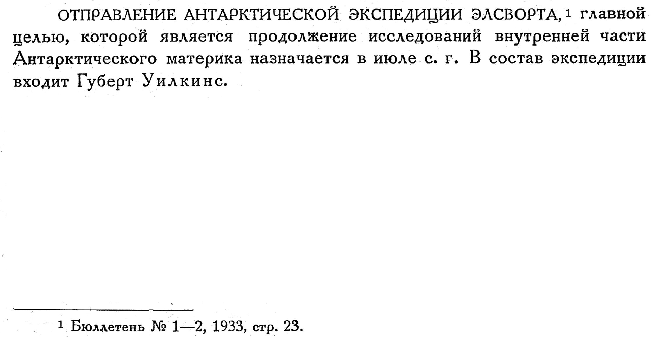 ОТПРАВЛЕНИЕ АНТАРКТИЧЕСКОЙ ЭКСПЕДИЦИИ ЭЛСВОРТА, 1) главной целью, которой является продолжение исследований внутренней части Антарктического материка назначается в июле с. г. В состав экспедиции входит Губерт Уилкинс.