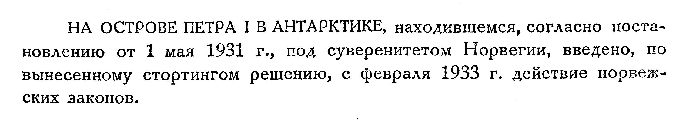 НА ОСТРОВЕ ПЕТРА I В АНТАРКТИКЕ, находившемся, согласно постановлению от 1 мая 1931 г., под суверенитетом Норвегии, введено, по вынесенному стортингом решению, с февраля 1933 г. действие норвежских законов.