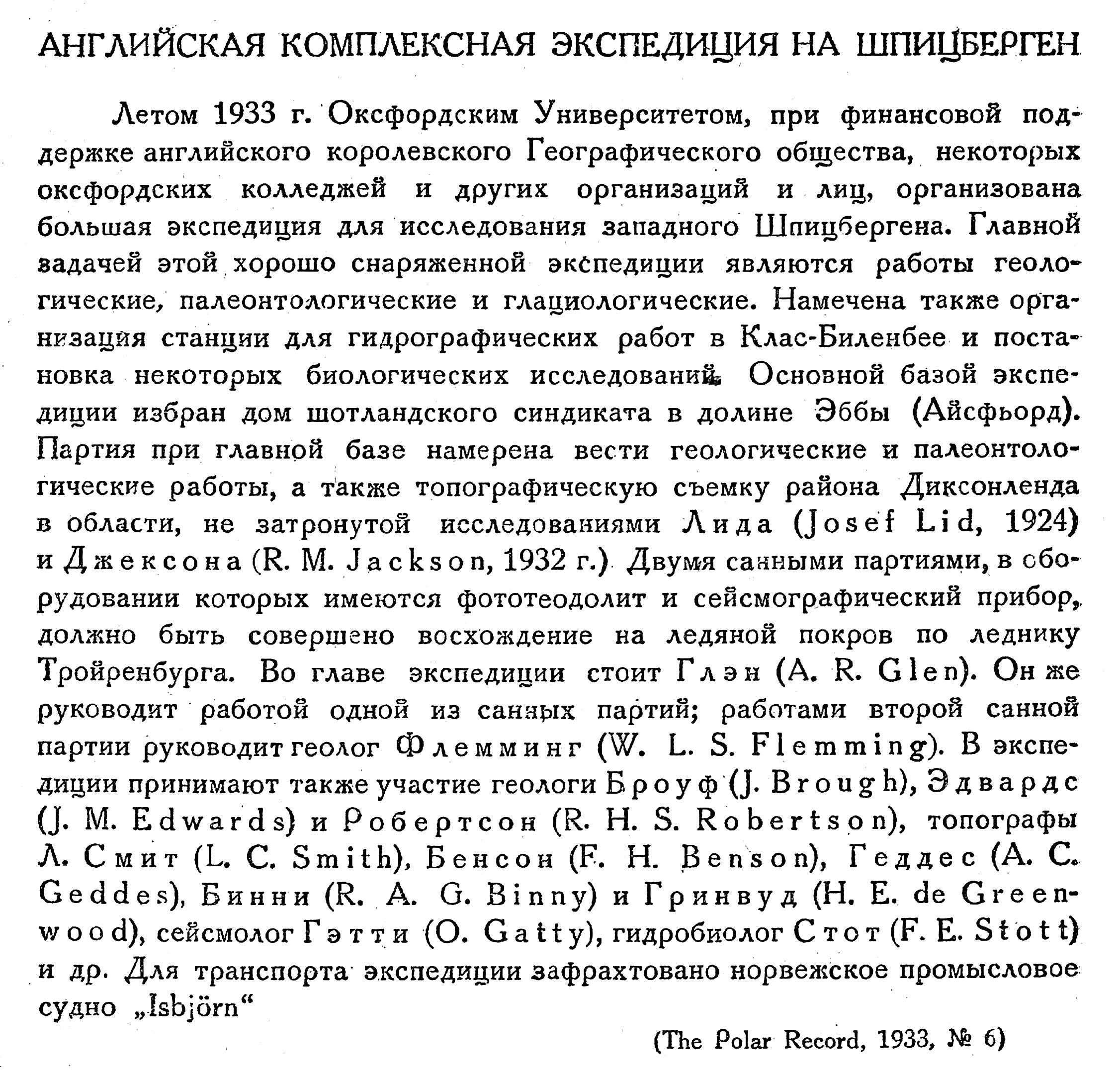 Летом 1933 г. Оксфордским Университетом, при финансовой поддержке английского королевского Географического общества, некоторых оксфордских колледжей и других организаций и лиц, организована большая экспедиция для исследования западного Шпицбергена. Главной задачей этой хорошо снаряженной экспедиции являются работы геологические, палеонтологические и глациологические. Намечена также организация станции для гидрографических работ в Клас-Биленбее и постановка некоторых биологических исследований Основной базой экспедиции избран дом шотландского синдиката в долине Эббы (Айсфьорд). Партия при главной базе намерена вести геологические и палеонтологические работы, а также топографическую съемку района Диксонленда в области, не затронутой исследованиями Лида (Josef Lid, 1924) и Джексонa (R. М. Jackson, 1932 г.) Двумя санными партиями, в оборудовании которых имеются фототеодолит и сейсмографический прибор, должно быть совершено восхождение на ледяной покров по леднику Тройренбурга. Во главе экспедиции стоит Глэн (A. R. Glen). Он же руководит работой одной из санных партий; работами второй санной партии руководит геолог Флемминг (W. L. S. Flemming). В экспедиции принимают также участие геологи Броуф (J. Brough), Эдвардс (J. М. Edwards) и Робертсон (R. Н. S. Robertson), топографы Л. Смит (L. С. Smith), Бенсон (F. Н. Benson), Геддес (А. С. Gеddеs), Бинни (R. A. G. Binny) и Гринвуд (Н. Е. de Greenwood), сейсмолог Гэтти (О. Gaty), гидробиолог Стот (F. Е. Stott) и др. Для транспорта экспедиции зафрахтовано норвежское промысловое судно "Isbjrn“.
