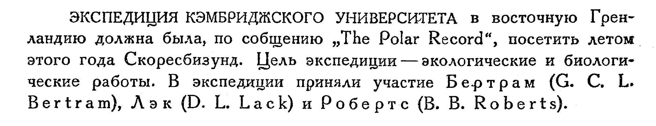 ЭКСПЕДИЦИЯ КЭМБРИДЖСКОГО УНИВЕРСИТЕТА в восточную Гренландию должна была, по сообщению „The Polar Record", посетить летом этого года Скоресбизунд. Цель экспедиции — экологические и биологические работы. В экспедиции приняли участие Бертрам (G. С. L. Веrtram), Лэк (D. L. Lack) и Робертс (В. В. Roberts).