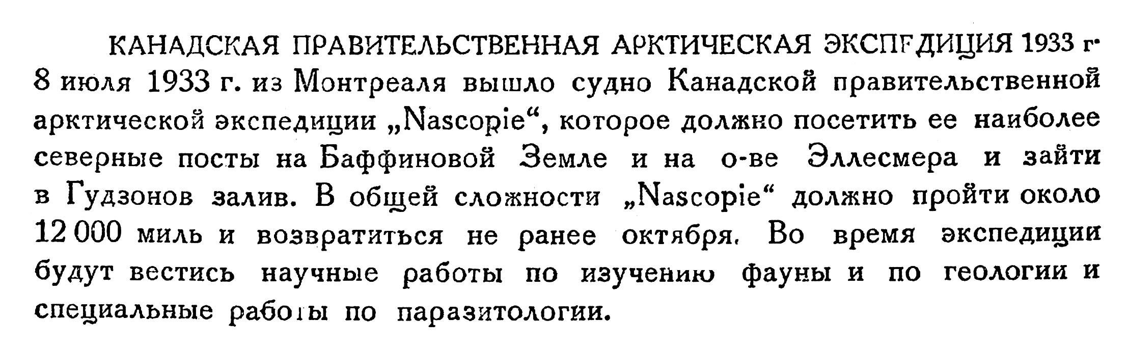 КАНАДСКАЯ ПРАВИТЕЛЬСТВЕННАЯ АРКТИЧЕСКАЯ ЭКСПЕДИЦИЯ 1933 ГОДА вышла 8 июля из Монреаля на судне „Nascopie". Главной задачей экспедиции являются снабжение и смена персонала на постах и станциях на Земле Баффина, Земле Эллесмера и в районе Гудзонова залива. Рейс „Nascopie" будет использован также для производства научных работ в области зоологии, ботаники, геологии и этнографии.