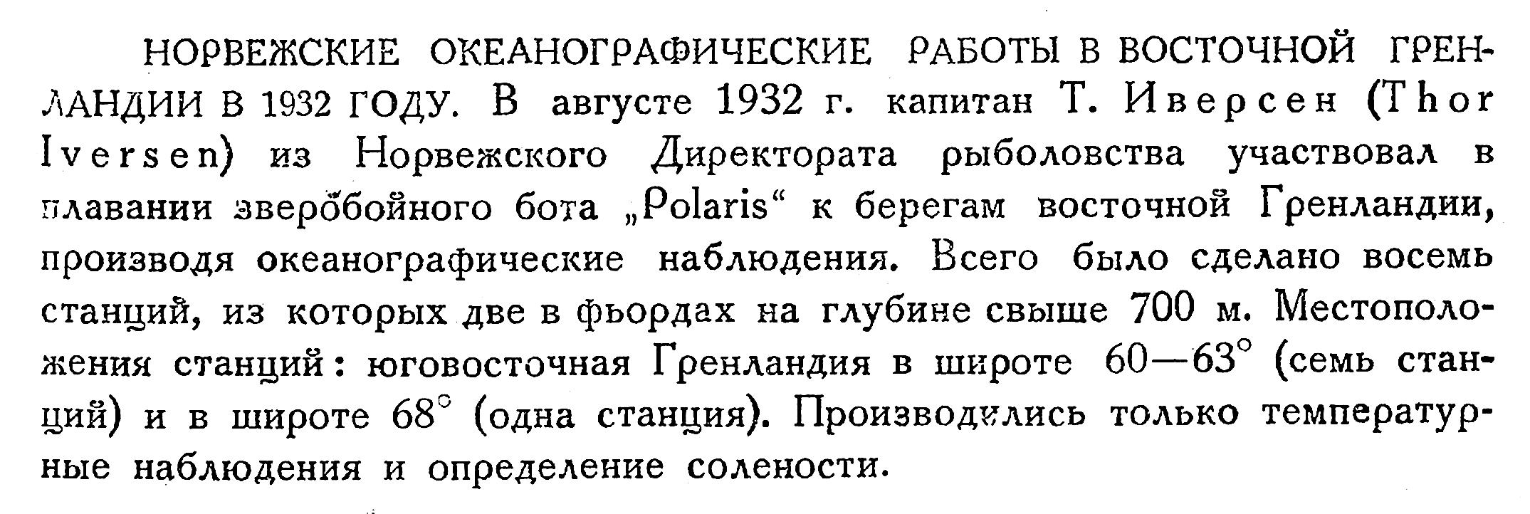 НОРВЕЖСКИЕ ОКЕАНОГРАФИЧЕСКИЕ РАБОТЫ В ВОСТОЧНОЙ ГРЕНЛАНДИИ В 1932 ГОДУ. В августе 1932 г. капитан Т. Иверсен (Thor Iversen) из Норвежского Директората рыболовства участвовал в плавании зверобойного бота „Polaris" к берегам восточной Гренландии, производя океанографические наблюдения. Всего было сделано восемь станций, из которых две в фьордах на глубине свыше 700 м. Местоположения станций: юговосточная Гренландия в широте 60—63° (семь станций) и в широте 68° (одна станция). Производились только температурные наблюдения и определение солености.