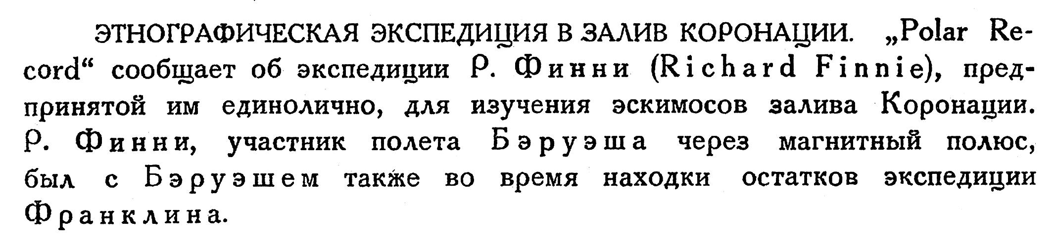 ЭТНОГРАФИЧЕСКАЯ ЭКСПЕДИЦИЯ В ЗАЛИВ КОРОНАЦИИ. „Polar Record" сообщает об экспедиции Р. Финни (Richard Finnie), предпринятой им единолично, для изучения эскимосов залива Коронации. Р. Финни, участник полета Бэруэша через магнитный полюс, был с Бэруэшем также во время находки остатков экспедиции Франклина.