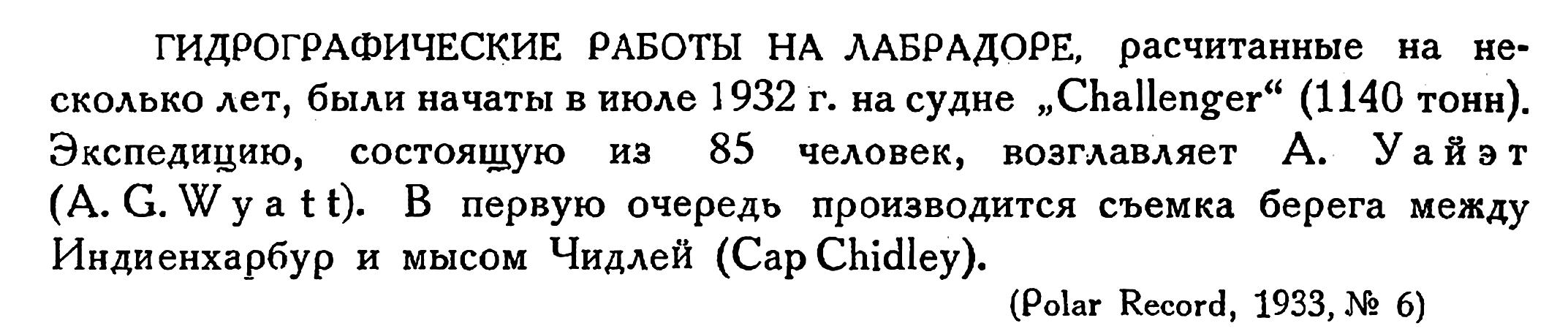 ГИДРОГРАФИЧЕСКИЕ РАБОТЫ НА ЛАБРАДОРЕ, рассчитанные на несколько лет, были начаты в июле 1932 г. на судне „Challenger" (1140 тонн). Экспедицию, состоящую из 85 человек, возглавляет А. Уайэт (A. G. Wуatt). В первую очередь производится съемка берега между Индиенхарбур и мысом Чидлей (Cap Chidley).