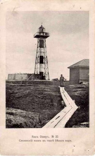 В декабре 1862 года Гидрографический департамент опубликовал в Морском сборнике извещение мореплавателям, в котором сообщил: "...в Белом море окончен постройкой на середине острова Сосновца маяк... деревянный восьмиугольный, обшитый досками, окрашен светло-желтой краской, а металлическая крыша серой краской. На маяке установлен металлический фонарь, снабженный осветительным аппаратом отражательной системы. Осветительный аппарат состоит из 13 ламп и 13 рефлекторов. Высота огня от основания 76 футов, а от уровня моря 139 футов. Будет введен в действие 1 августа 1863 года. Будет освещать весь горизонт. Дальность видимости 13.5 мили".